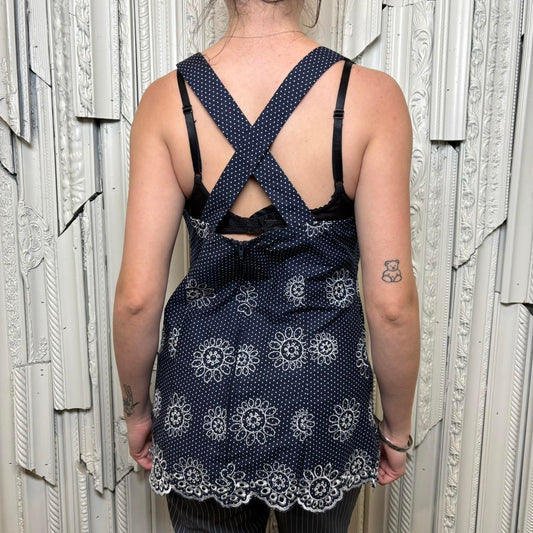 Studio Y blue and white polka dot and floral embroidery v neck blouse