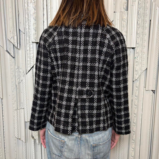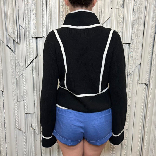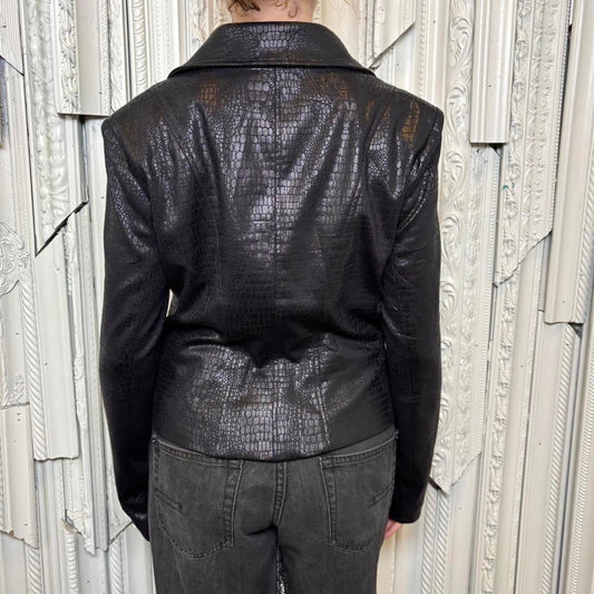 Cache polyester, rayon, spandex blend black snake print asymmetric zip up jacket