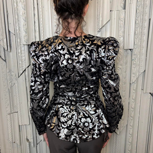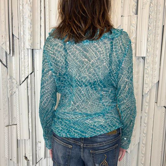 Bob Mackie silk sheer blue abstract print long sleeve blouse