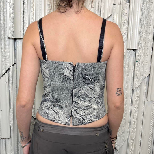 Flores & Flores grey black and silver rose print zipper closure tank top with boning
