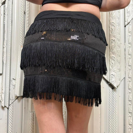 Forever 21 rayon/spandex blend black sequin and fringe mini skirt
