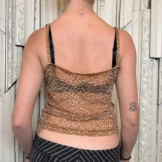 Mesh cheetah print spaghetti strap tank with ruffle detail