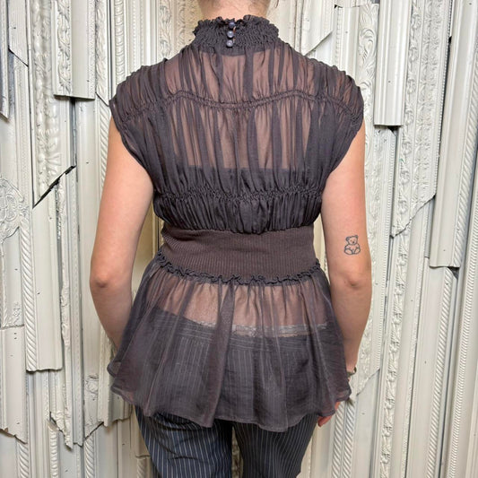 Lily Brown sheer grey mock neck ruched peplum top