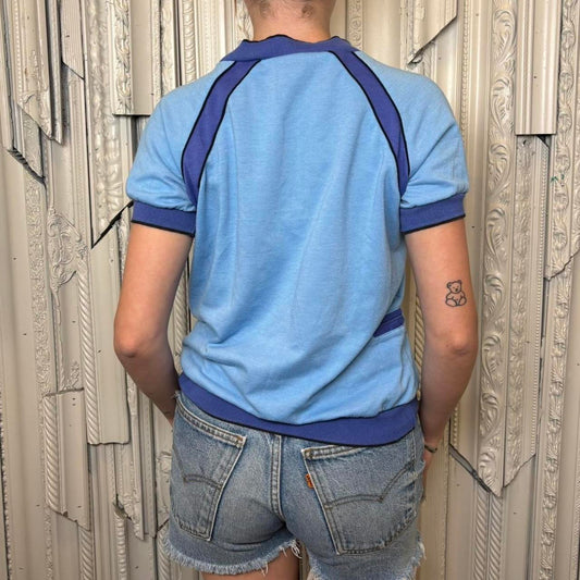Lindy Park 80s polyester sporty baby blue and purple v neck tee