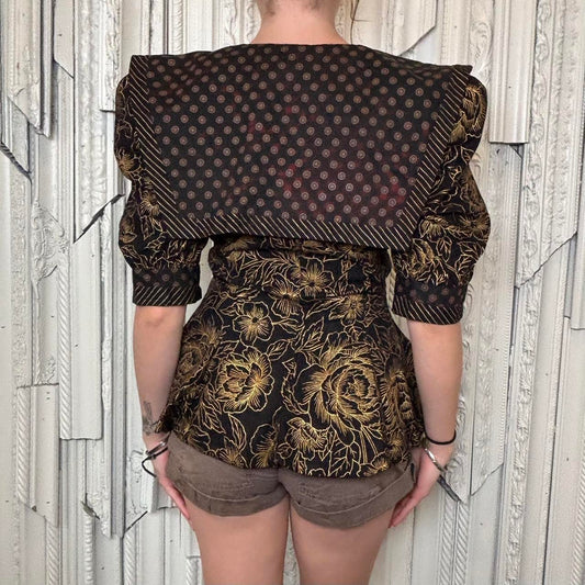 Leslie Lucks 80s floral print button down peplum blouse with large sailor collar