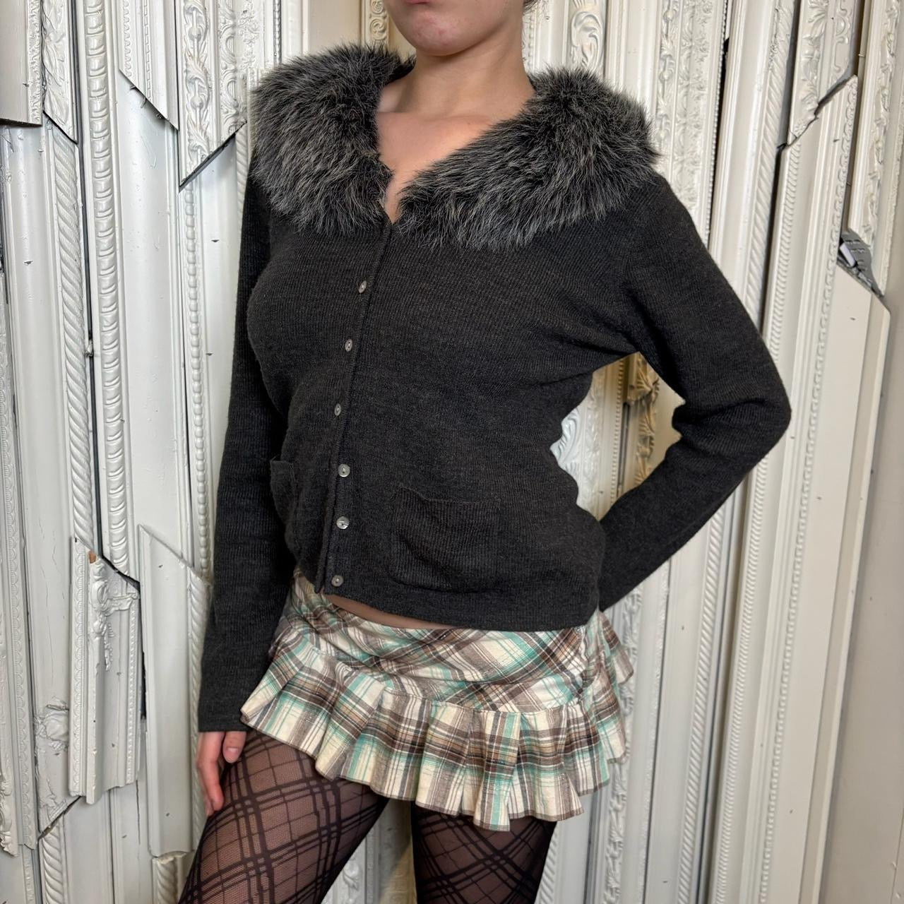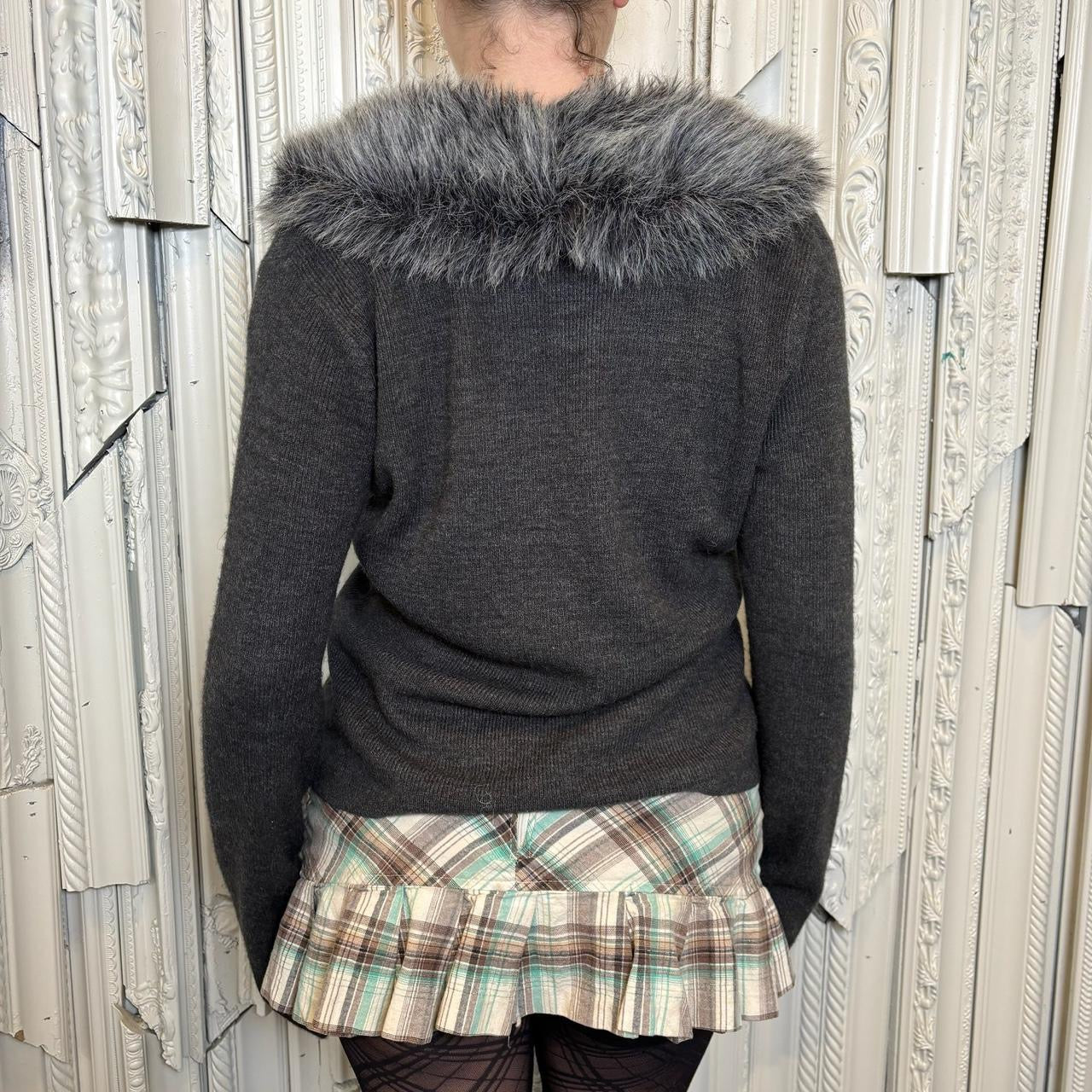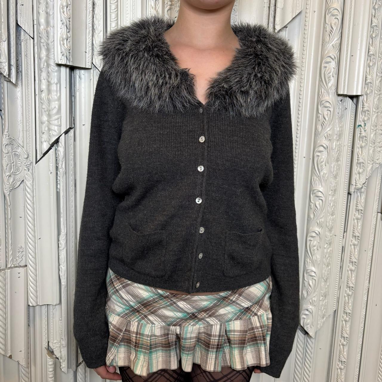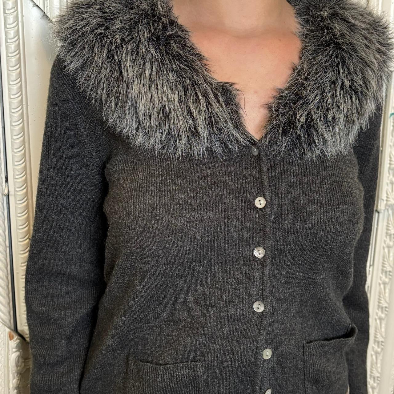 Amanda Smith 100% acrylic grey knit button down cardigan with pockets and removable faux fur collar, made in Hong Kong. Sweater is in good condition but has a spot of discoloration on chest. Tag size medium, best for s/m. Model is 5’3 and wears size small.
