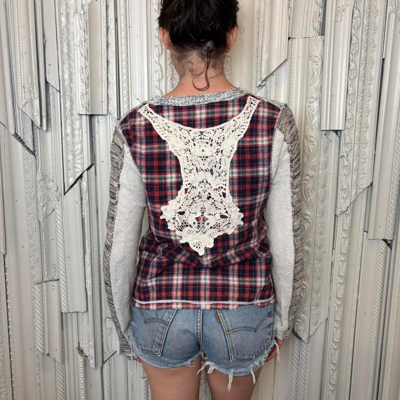 BKE multicolored knit snap closure sweater with plaid print back and embroidery detailing. Sweater is in excellent condition. Tag size small, best fit for xs/s. Model is 5’3 and wears size small.