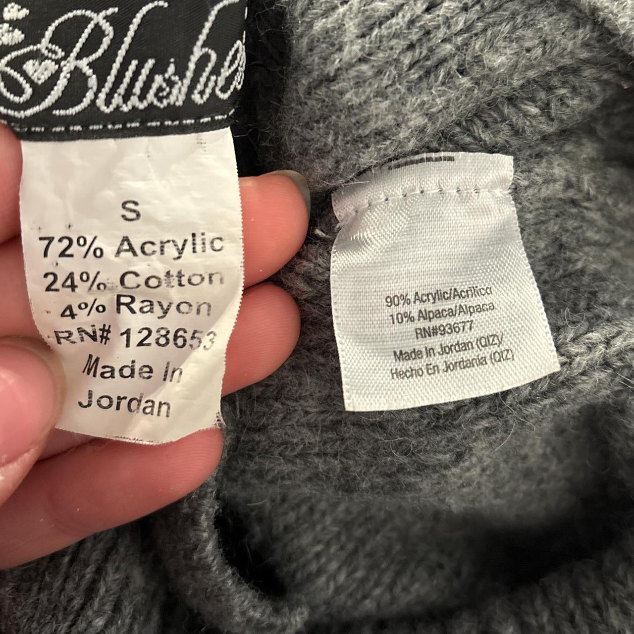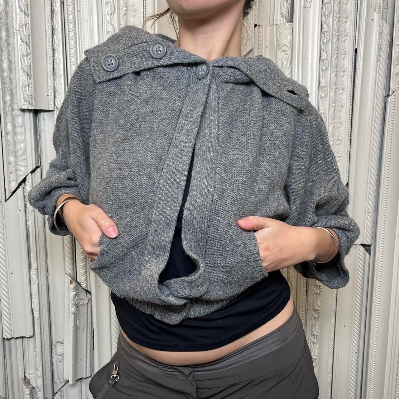 Y2K grey cropped knit sweater with grey buttons, bat wing sleeves and pockets by Blushed, can be worn turtleneck or collared. Sweater is in excellent condition. Tag size small, best for small.