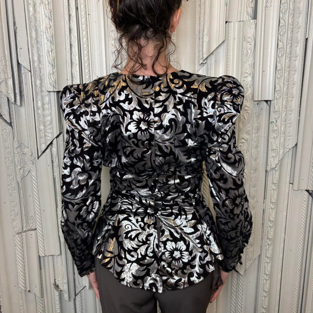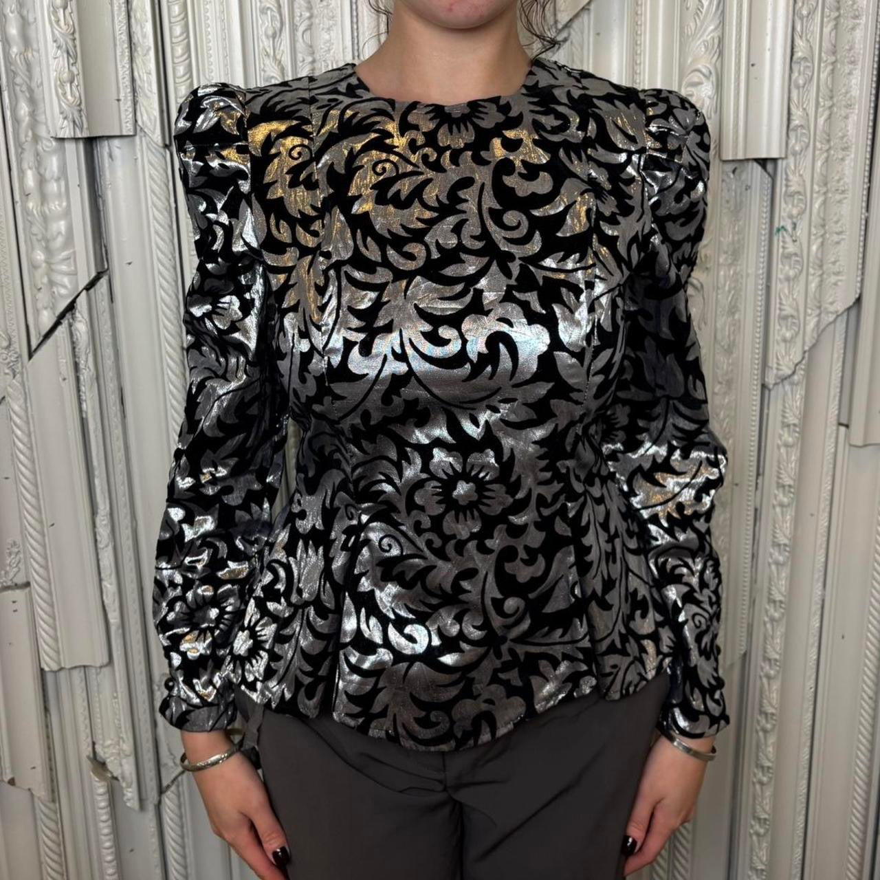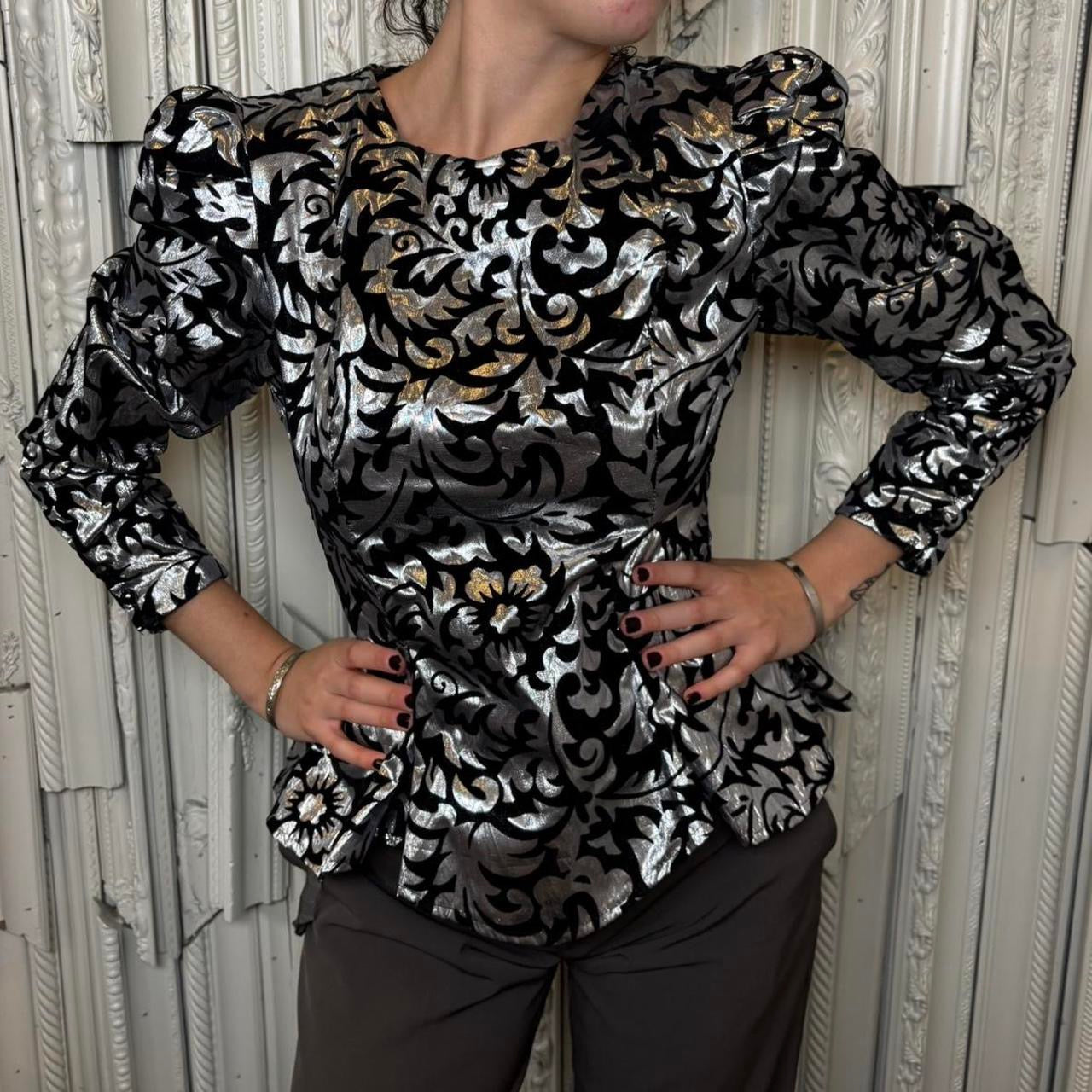 Cachet 80s silver and black abstract print peplum top with shoulder pads and back button down closure. top is in excellent condition. No tag size, best fit for small. Model is 5’3 and wears size small.
