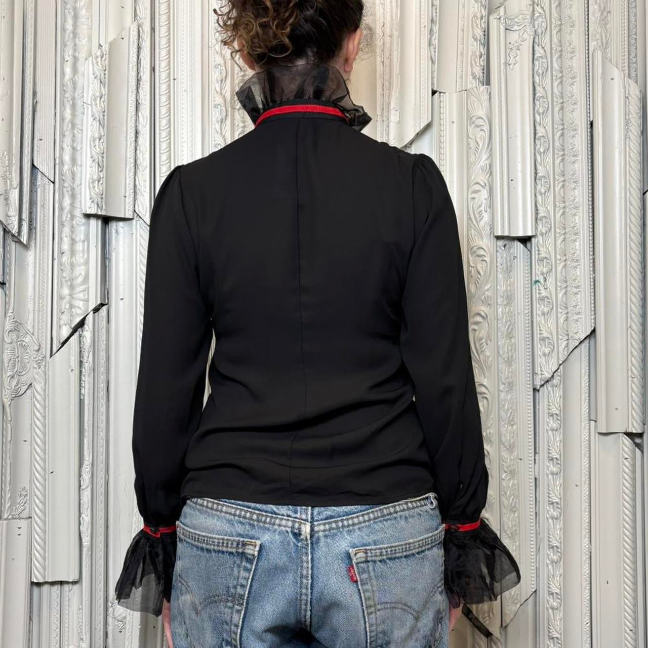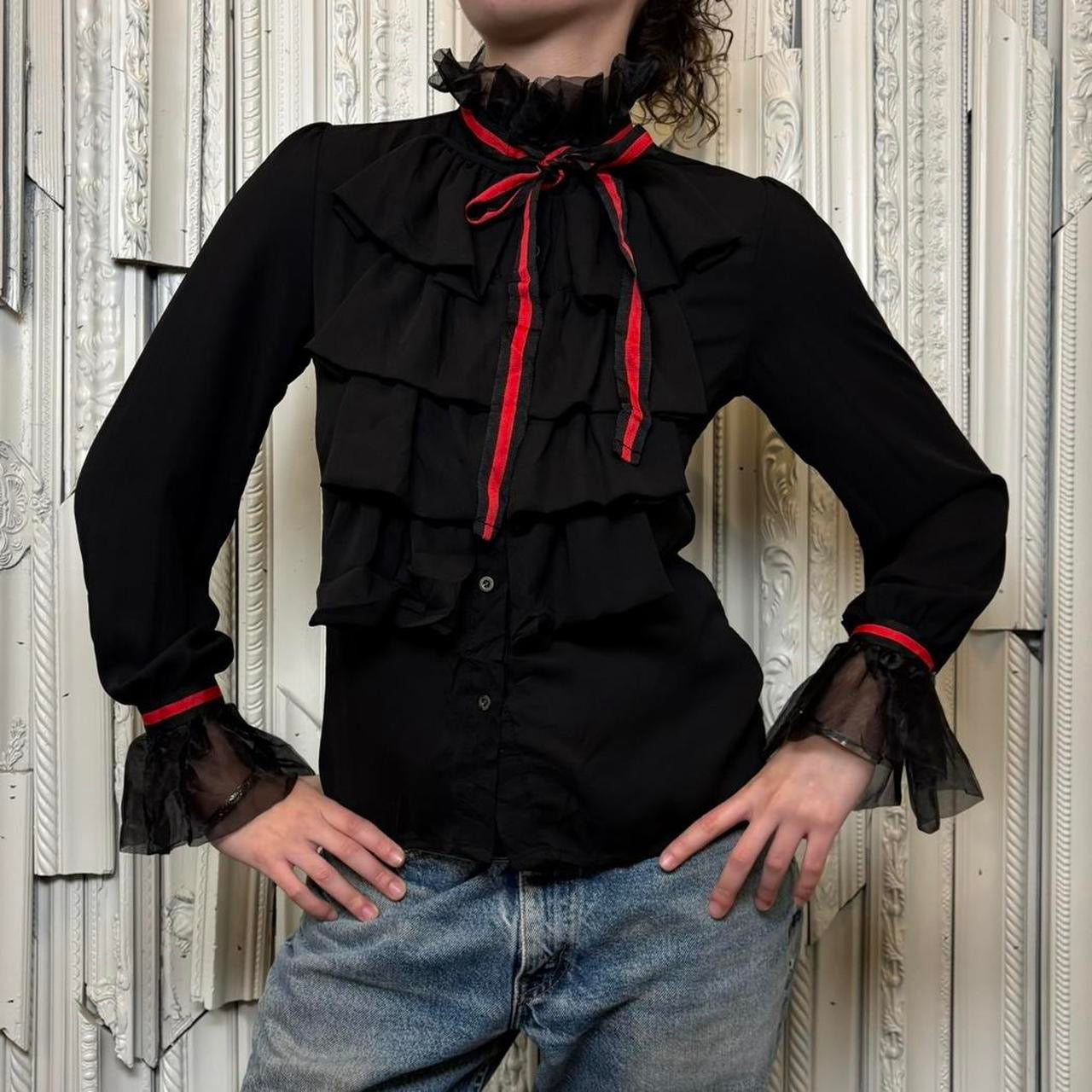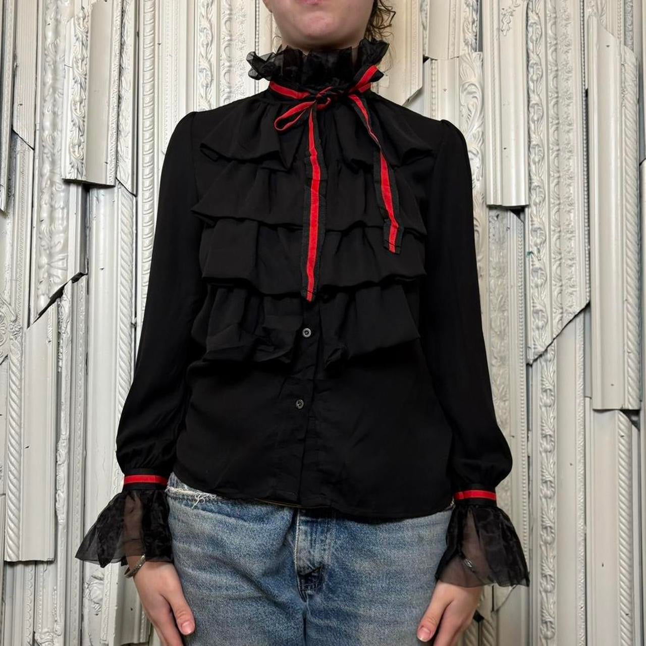 Dice black polyester tiered ruffle bust button down blouse with sheer ruffle collar and sleeve hems and red and black ribbon. Top is in excellent condition. Tag size small, best fit for xs/s. Model is 5’3 and wears size small.