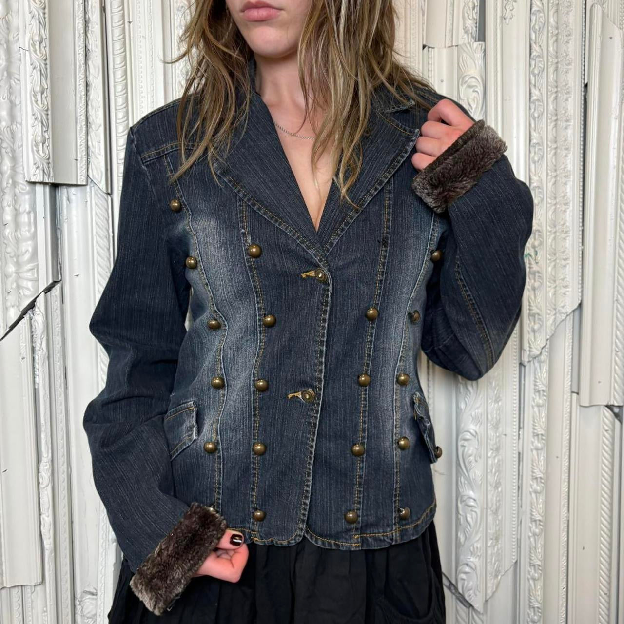 Elite Jeans y2k dark wash denim button down collared jack with brass studs and faux fur trim on sleeves. Jacket is in good condition but has one of the studs missing and some holes as shown. Tag size XL, best fit for m-xl. Model is 5’9 and wears size small.