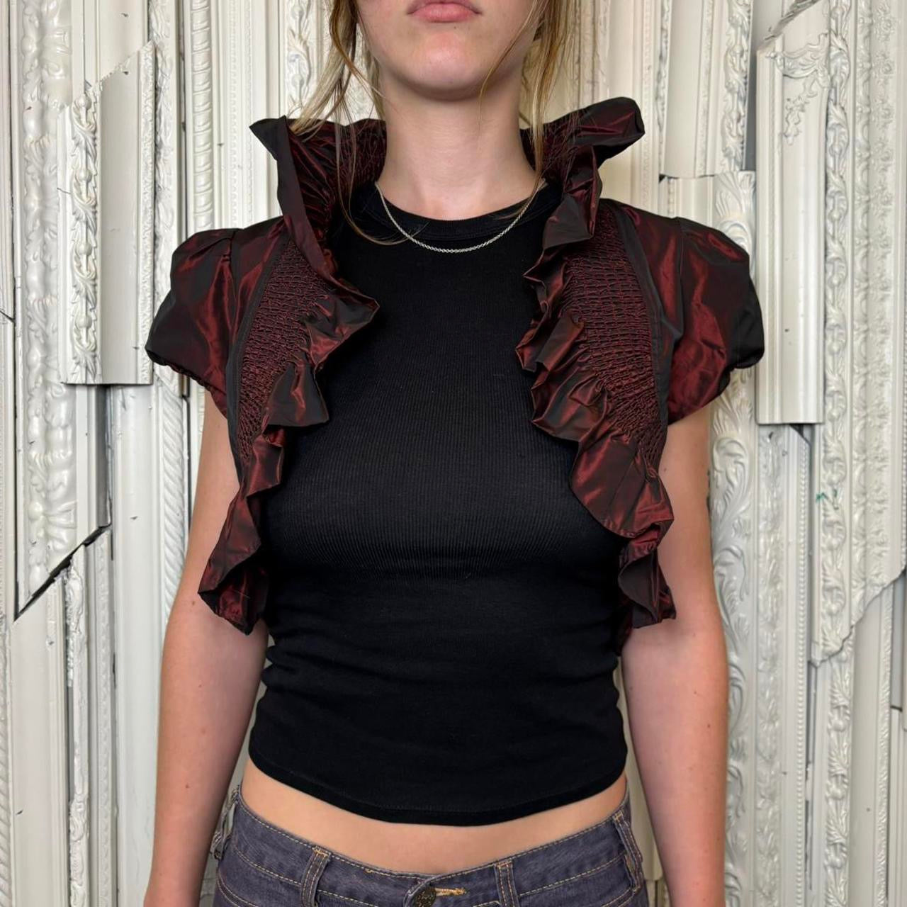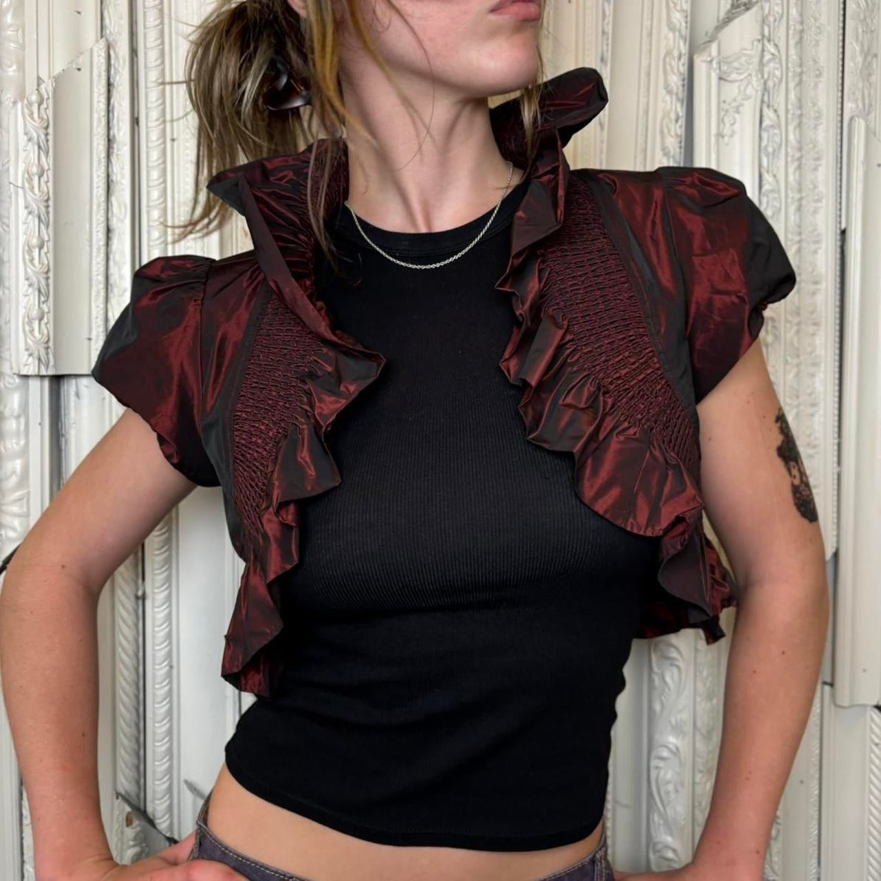 Forever 21 y2k red/black polyester shrug bolero with popped collar and ruching. This piece is in excellent condition. Tag size large, best fit for medium. Model is 5’9, and wears size small.