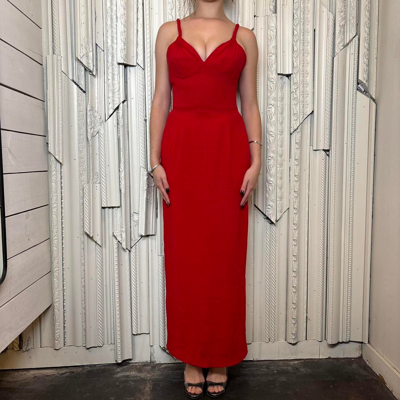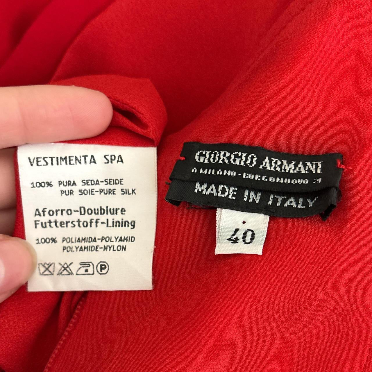 Giorgio Armani Vestimenta Spa 100% silk 90s red double corseted gown with slit in back. Gown is in excellent condition but has padding in cups that needs reshaping. Tag size 40, best fit for small. Model is 5’3 and wears size small.