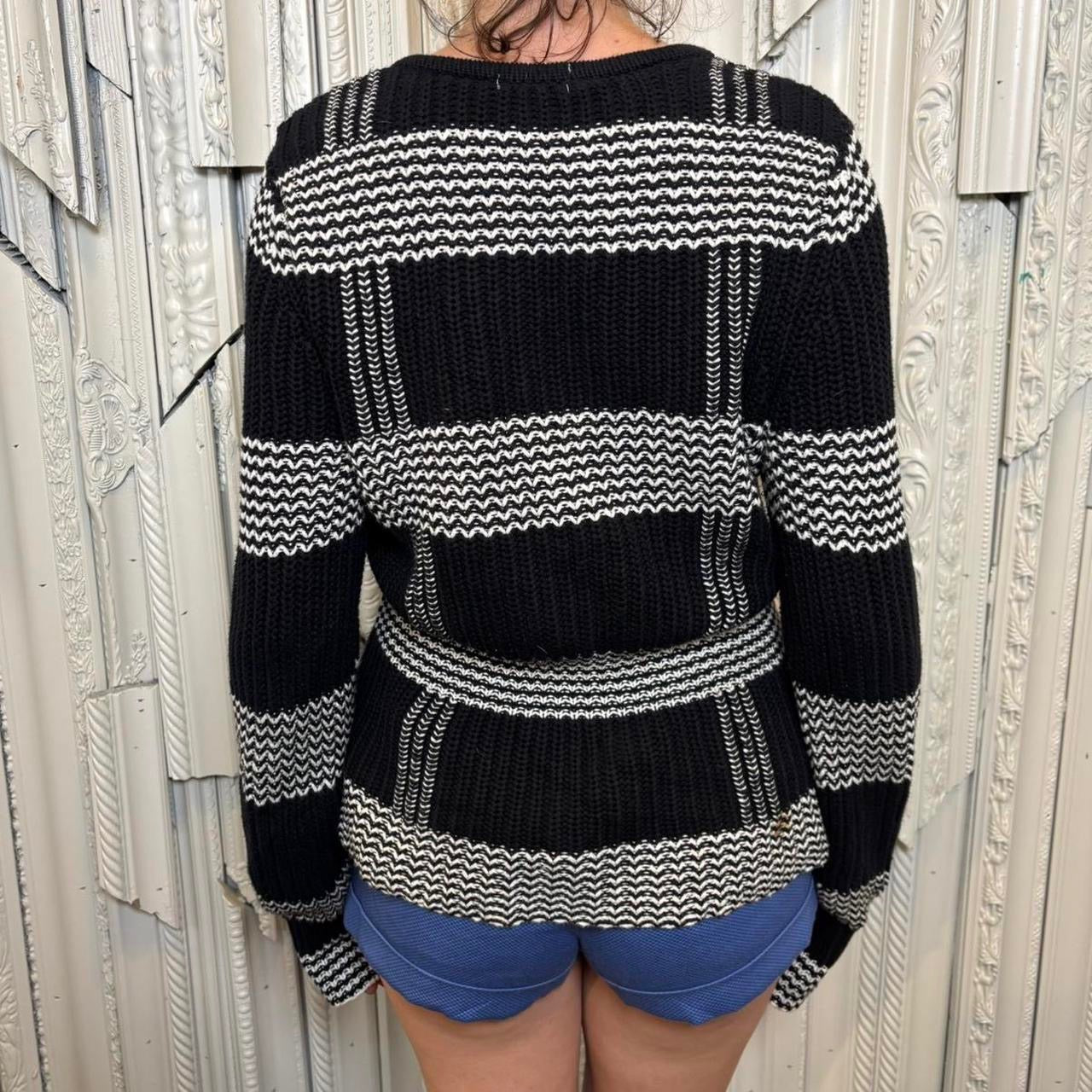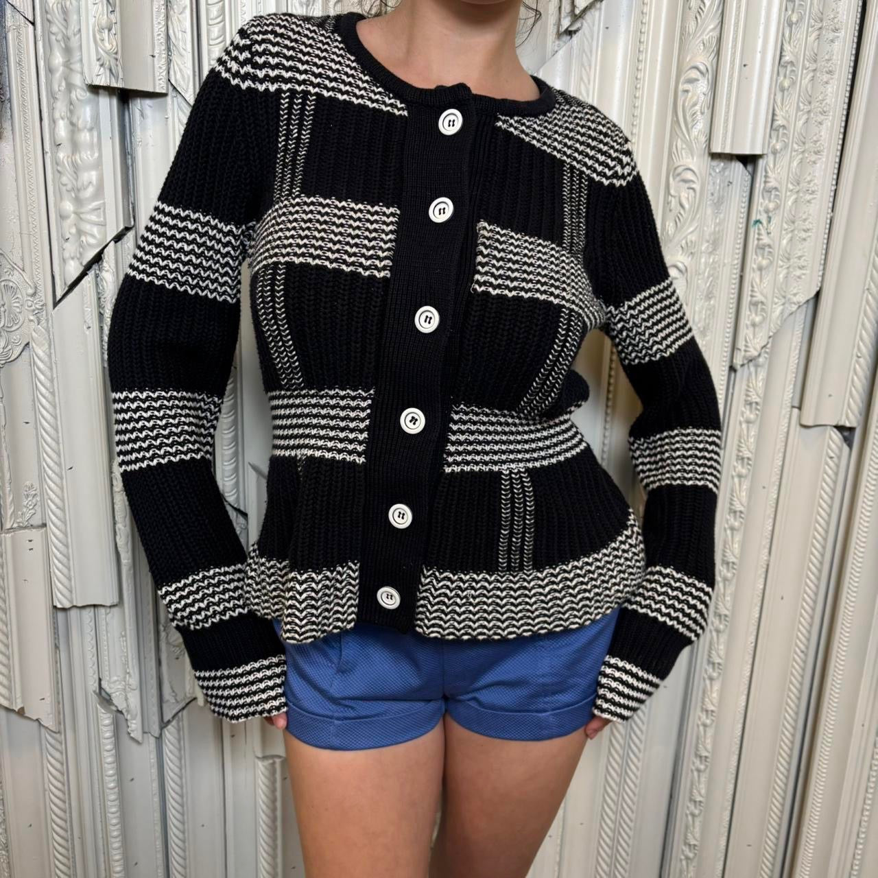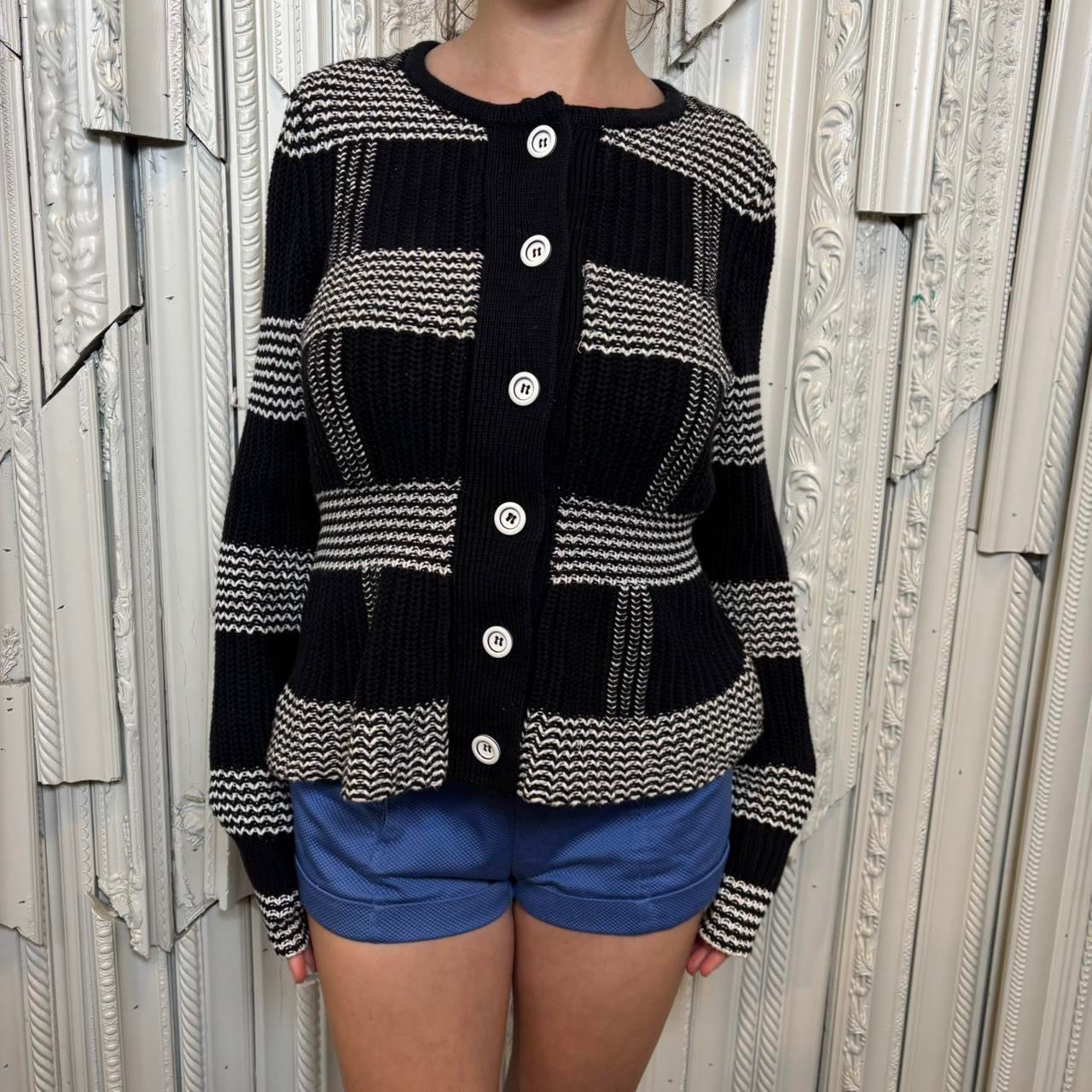 Black and white cotton knit peplum sweater with white buttons by Harold’s, made in Hong Kong. Sweater is in excellent condition. Tag size medium, best for medium.