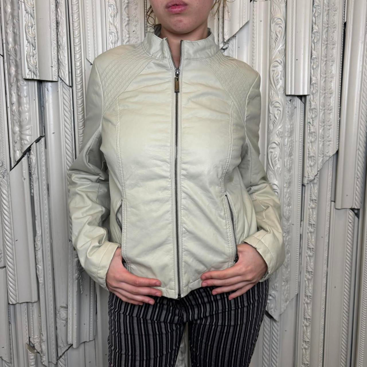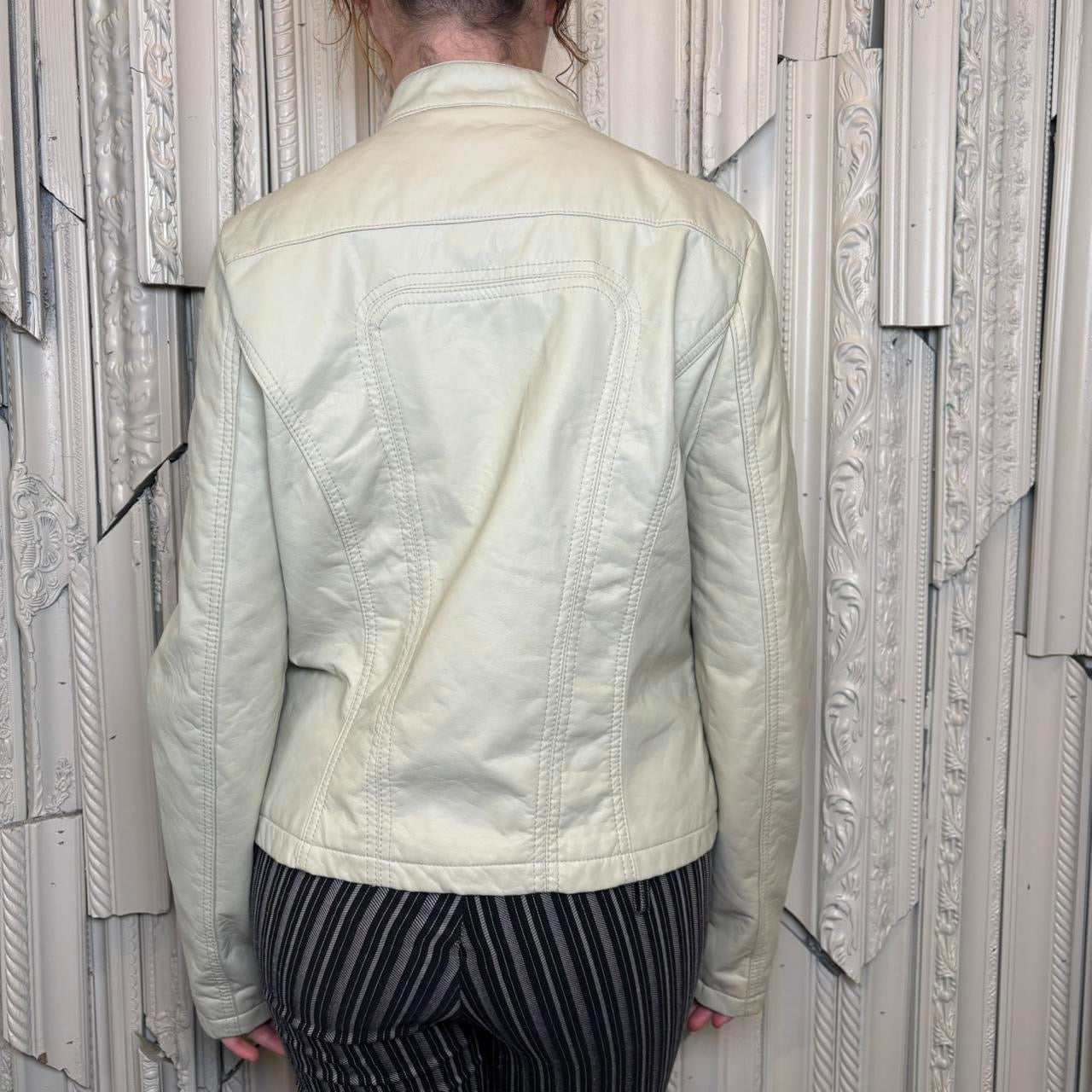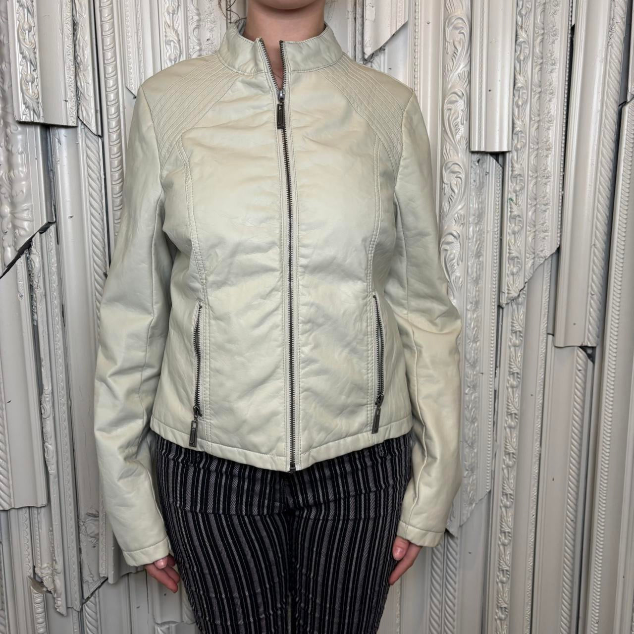 J2 polyester/polyurethane blend off white moto style zip up jacket. Jacket is in good condition but has a few small stains throughout. Tag size large, best fit for M/L. Model is 5’3 and wears size small.