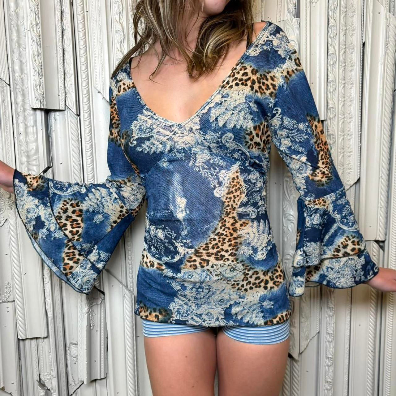 Jamie Nicole 100% acrylic v neck paisley print and animal print with bell sleeves and tie waist, made in USA. Top is in excellent condition. Tag size large, best fit for M/L. Model is 5’9 and wears size small.
