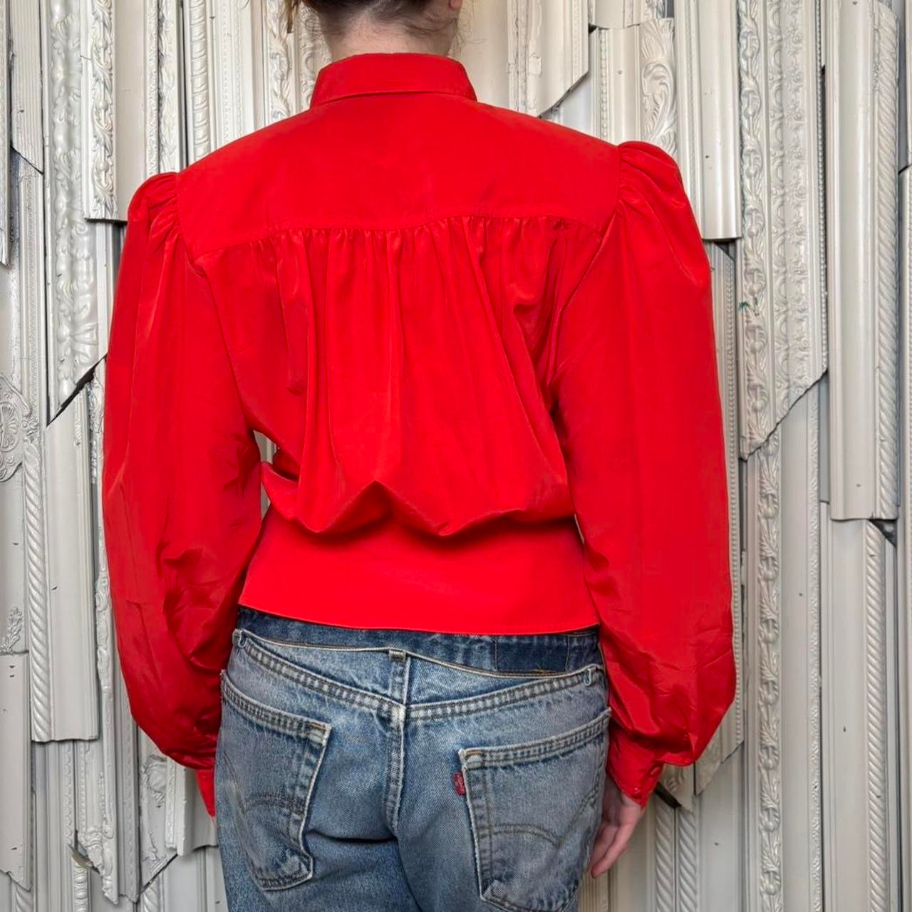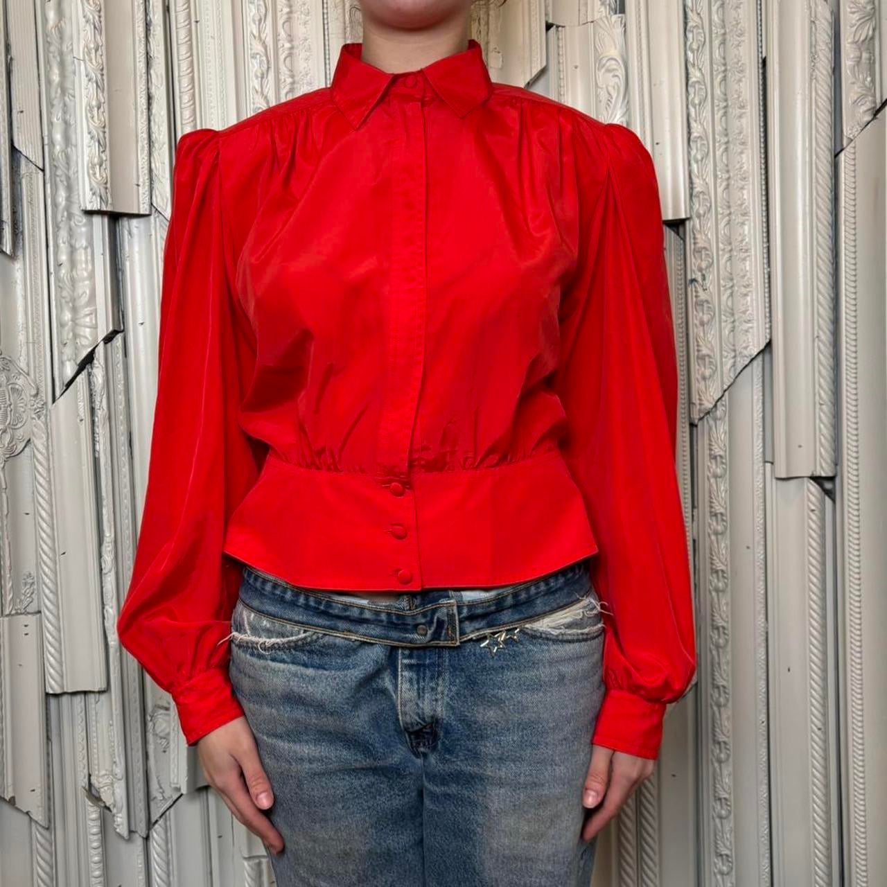 Josephine Petites red polyester button down collared blouse with shoulder pads and accentuated waist. Blouse is in excellent condition. Tag size 12, best fit for s/m. Model is 5’3 and wears size small.