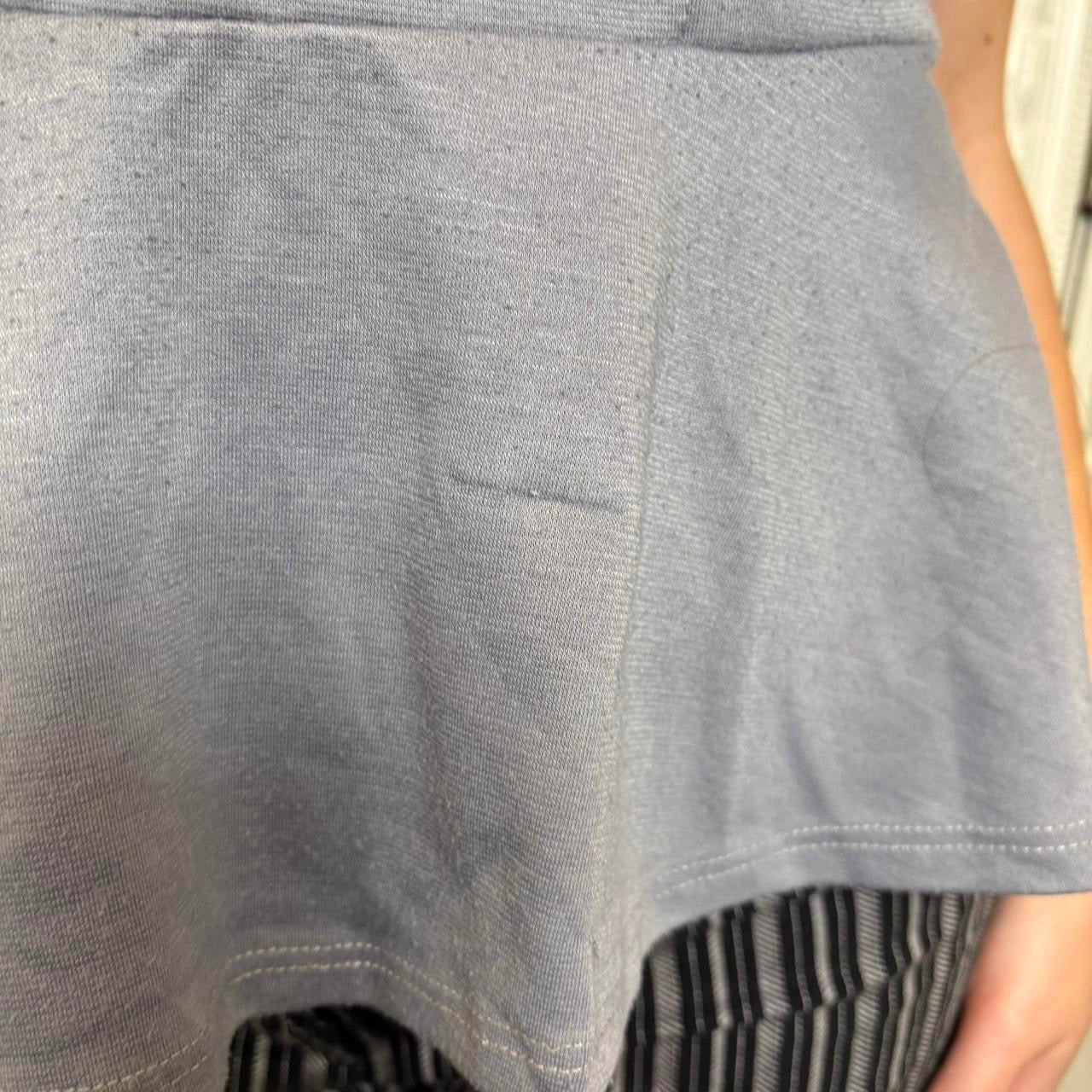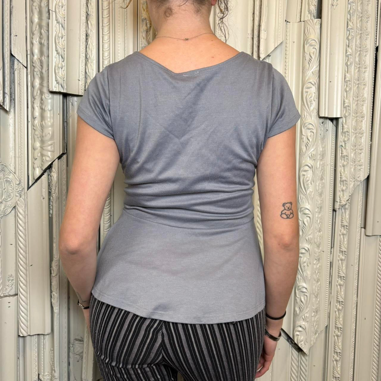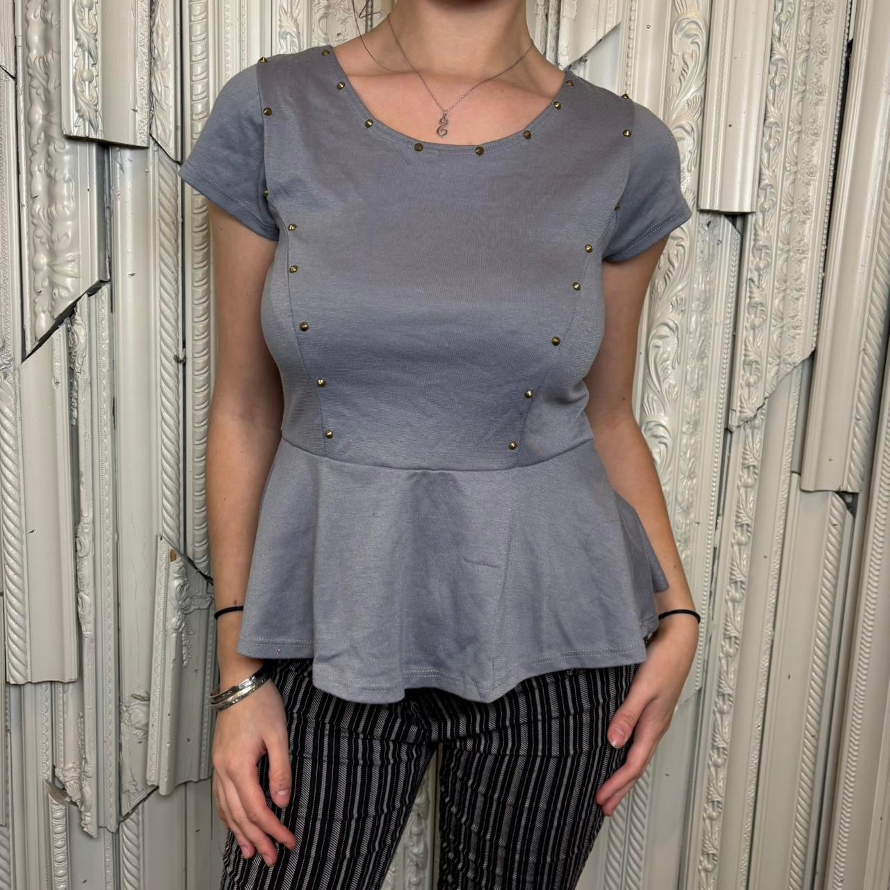 Julia grey short sleeve scoop neck peplum top with gold studs on bust. Top has a few runs as shown in photos. . Contents and tag size has faded, best fit for size small. Model is 5’3 and wears size small. I assume the shirt is a cotton spandex blend, it’s stretchy t-shirt material.