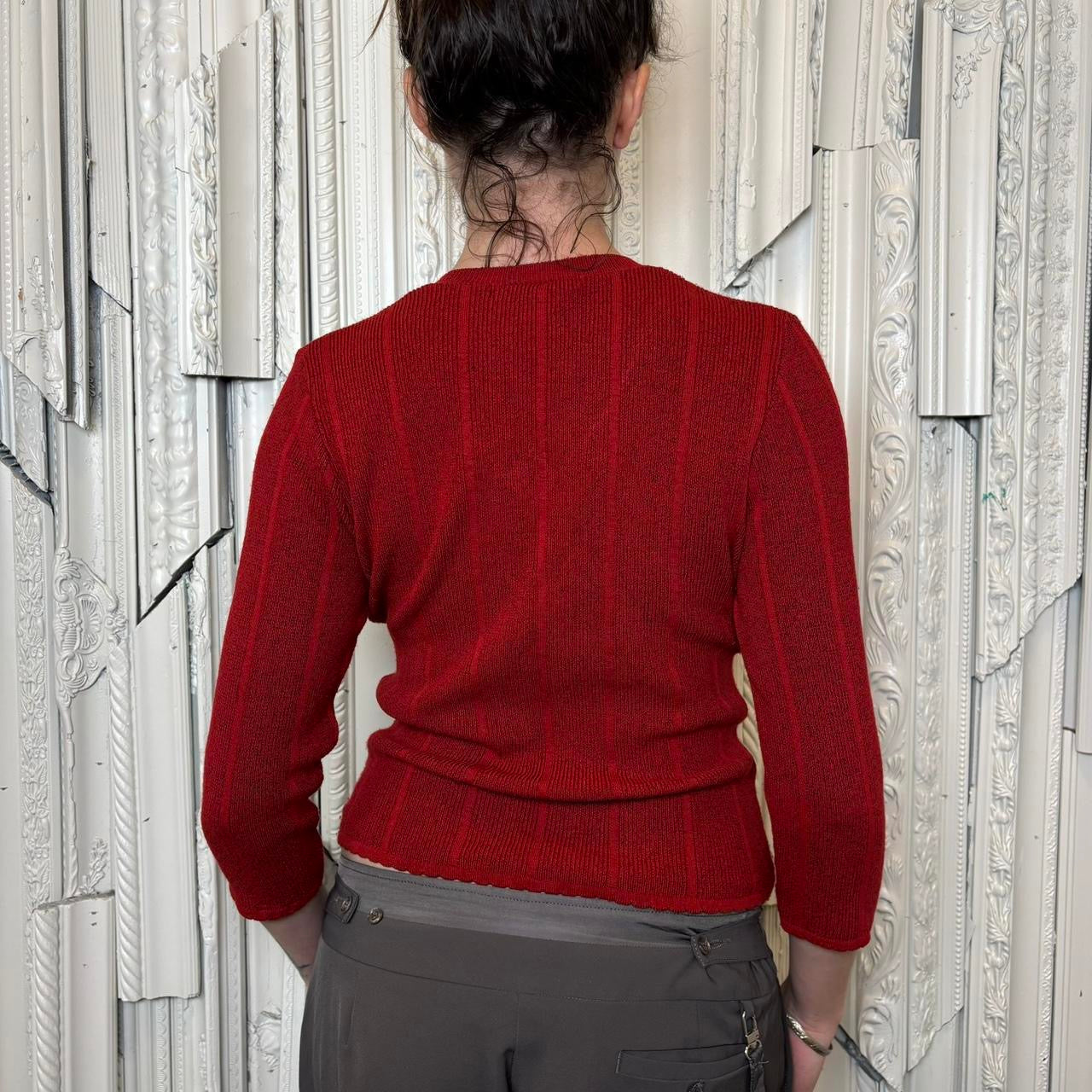 La Belle acrylic/spandex blend red v neck quarter sleeve knit top, made in USA. Top is in excellent condition. Tag size large, best fit for medium. Model is 5’3 and wears size small.