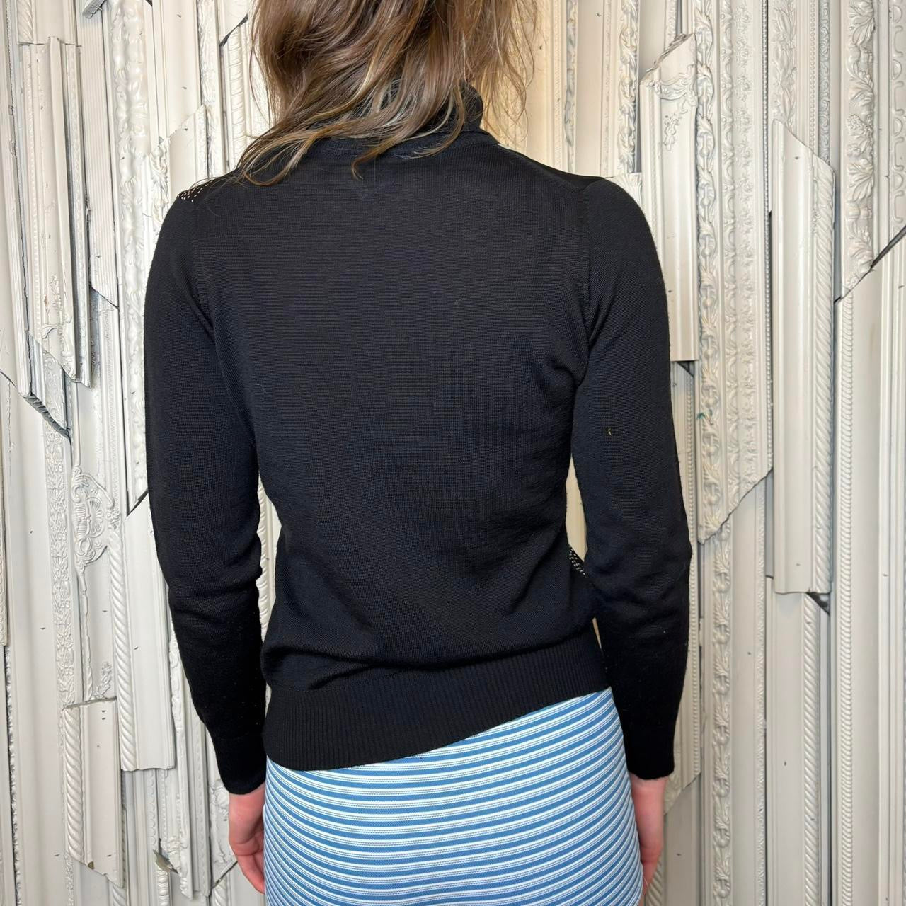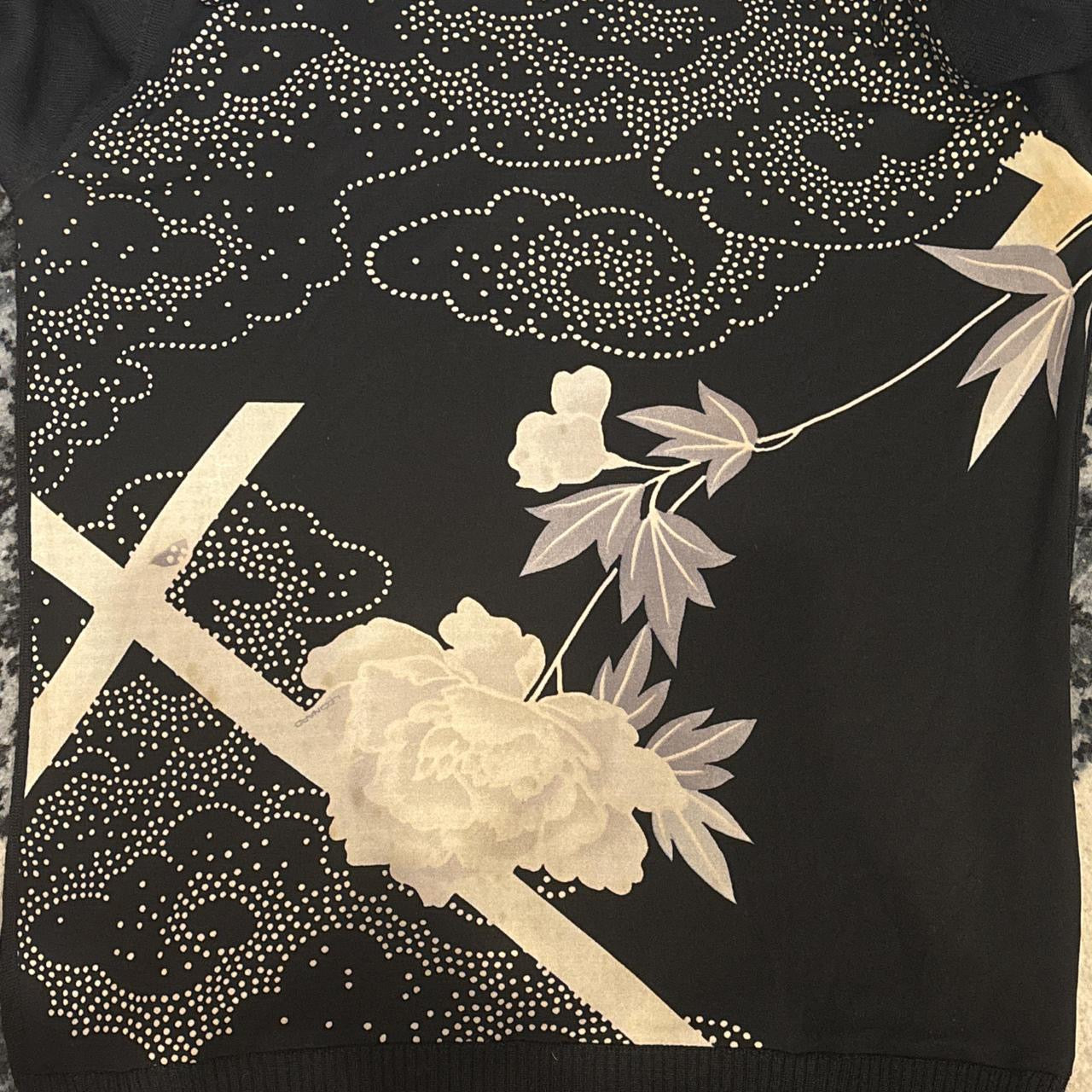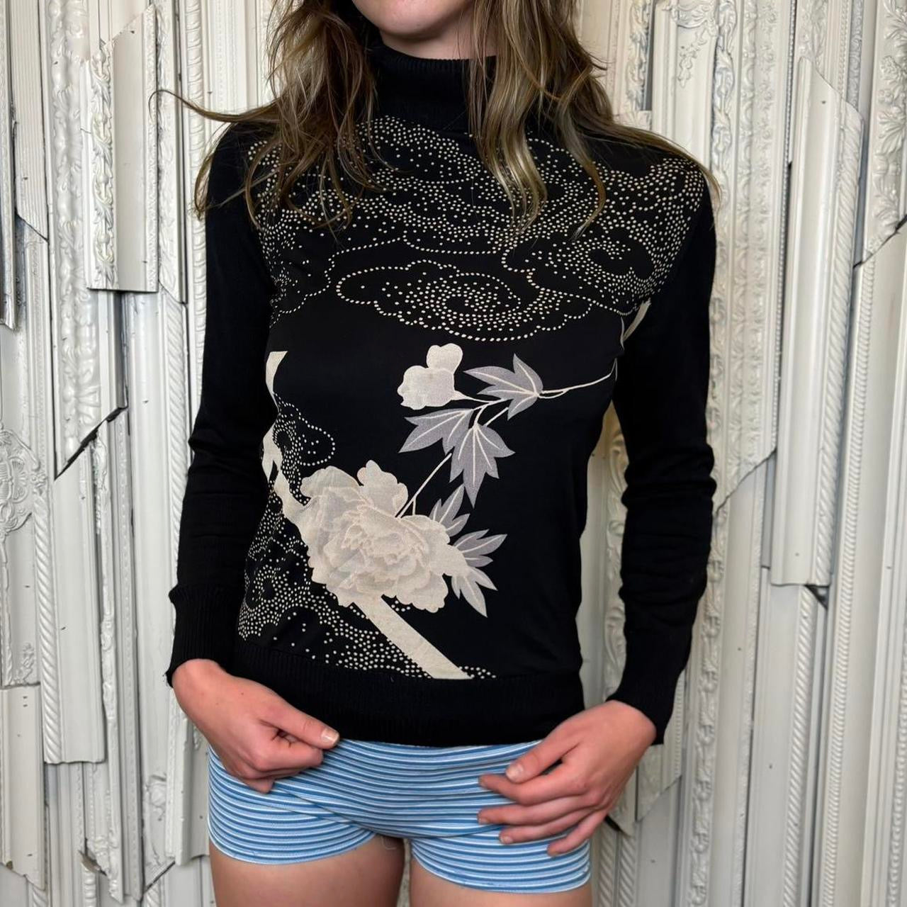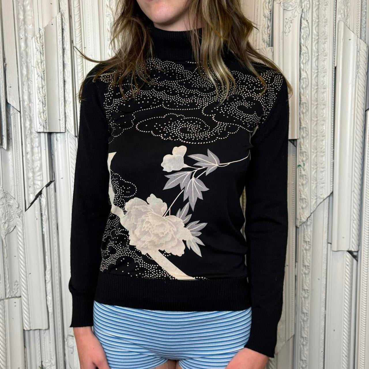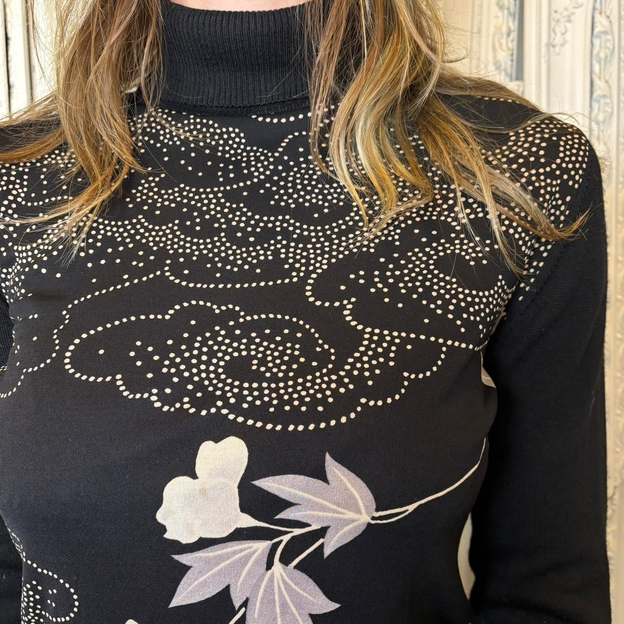 Leonard Fashion black 100% silk knit turtleneck top with floral print on front, made in France. Top is in good condition but has some stains as shown in photos. No tag size, best fit for small. Model is 5’9 and wears size small.