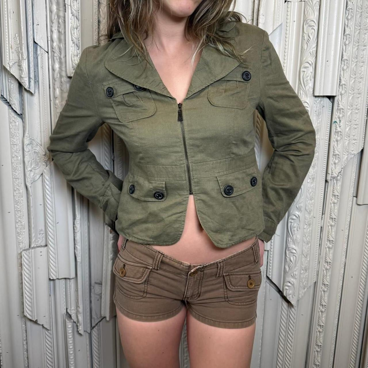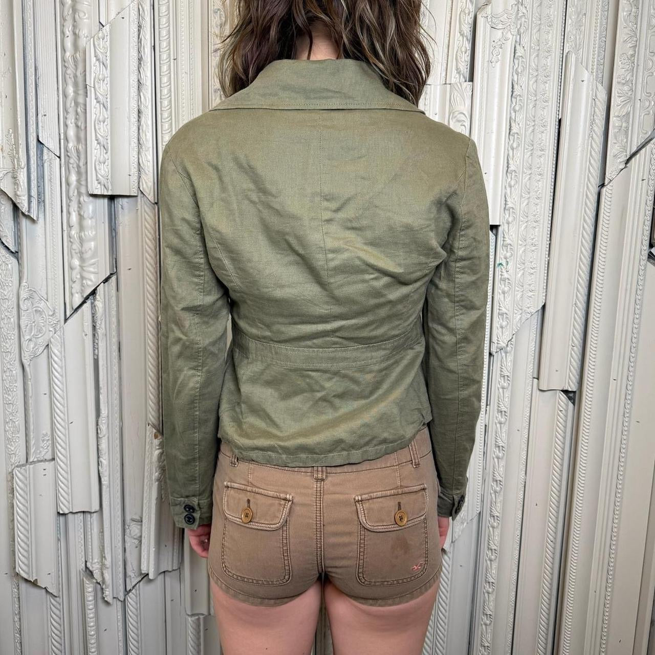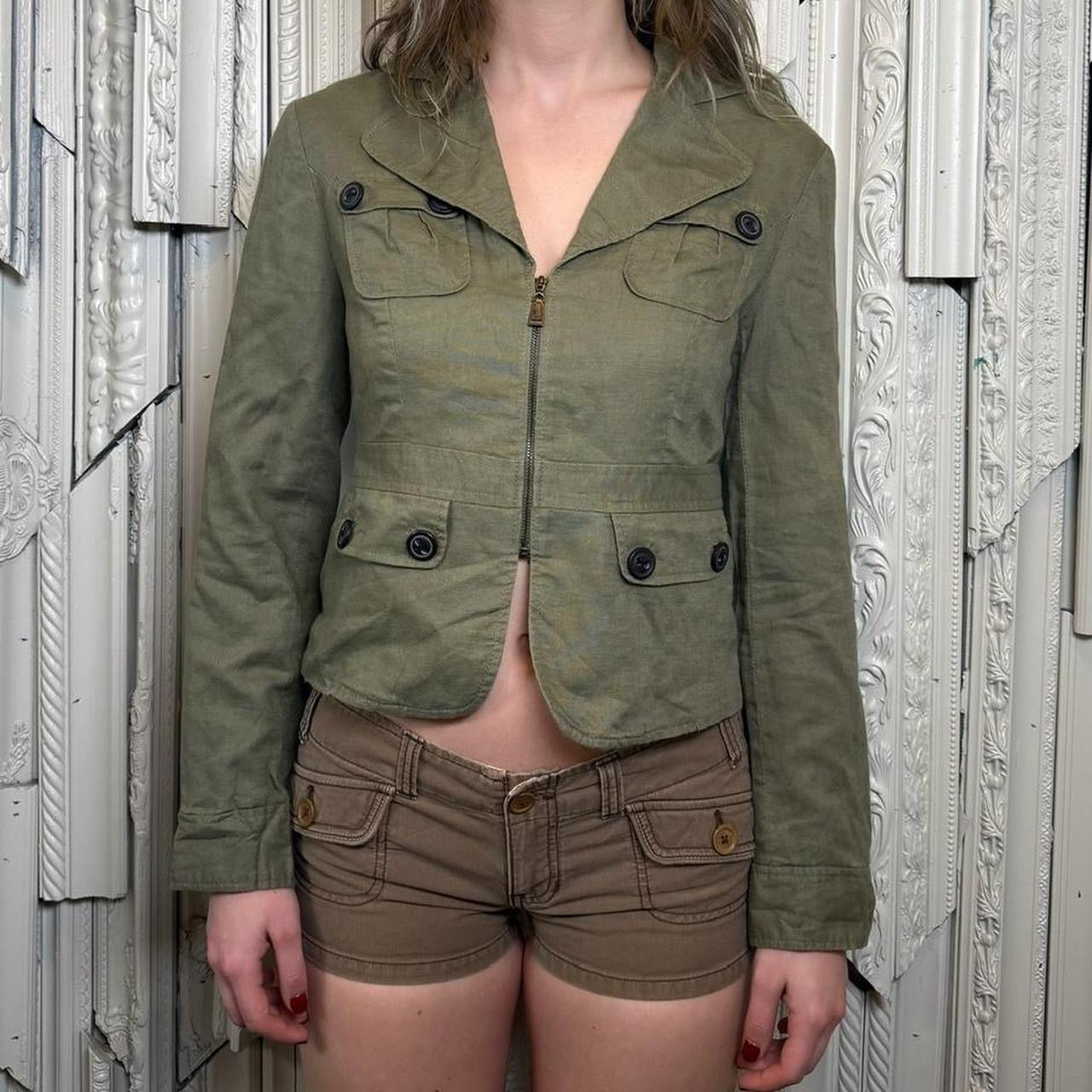 Army green collared zip up jackets with two real pockets and two fake pockets by Mac and Jac. Jacket is in excellent condition. Tag size medium, best for medium. Model is 5’9 and wears size small. Bust 19” Waist 16” Length 19.5” Sleeve 24”