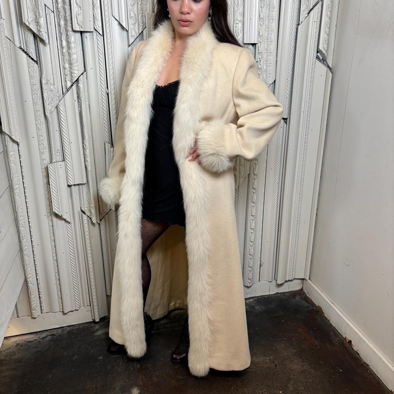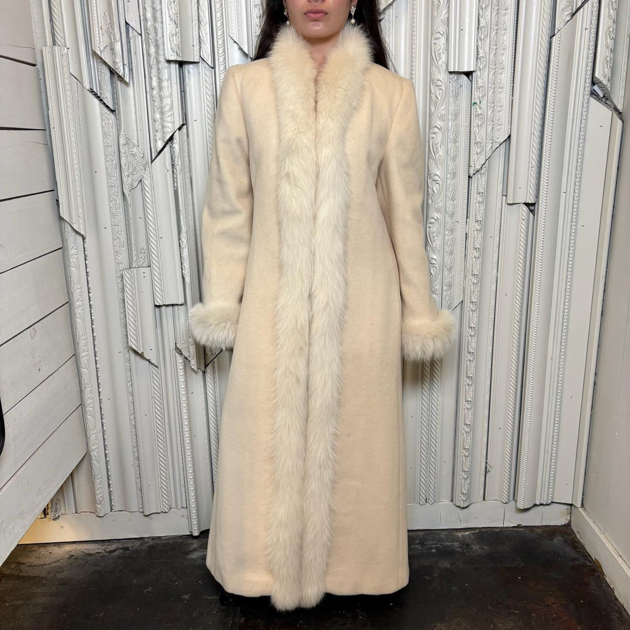 Marvin Richard’s lambswool trench coat with fur trim, hook closures and pockets, made in USA. Coat is in excellent condition.