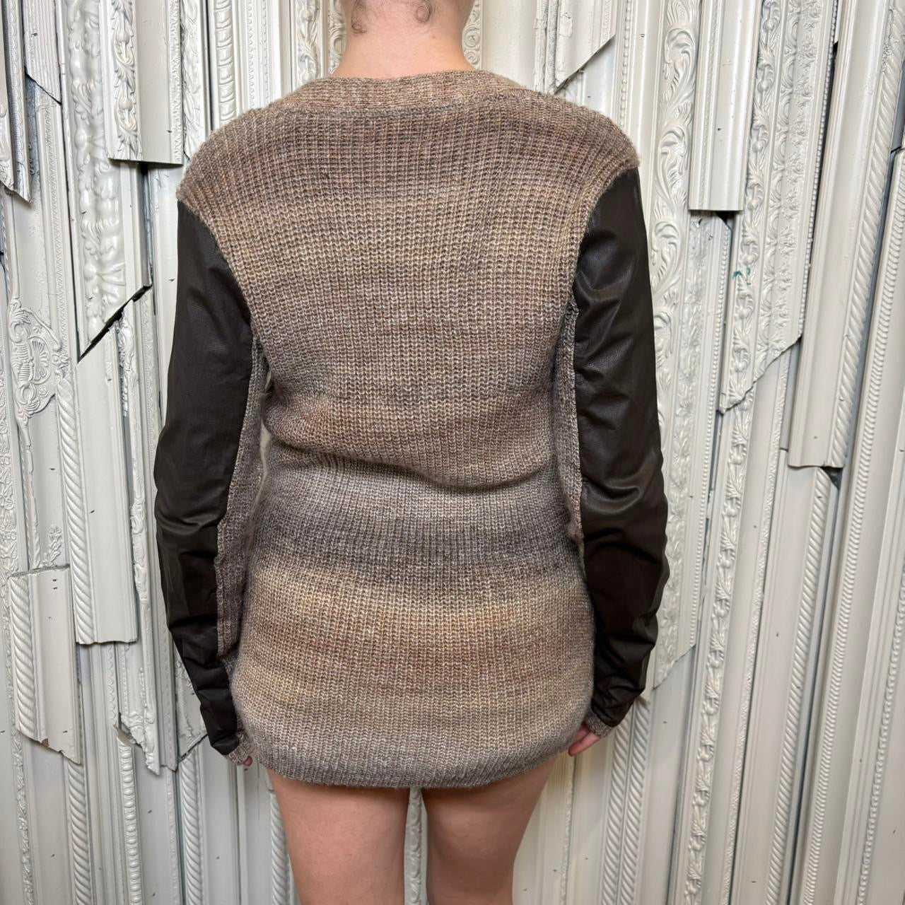Michael Stars multi tone brown 100% acrylic knit button down cardigan with pockets and leather sleeves. Sweater is in excellent condition. Tag size 2, best fit for s/m. Model is 5’3 and wears size small.