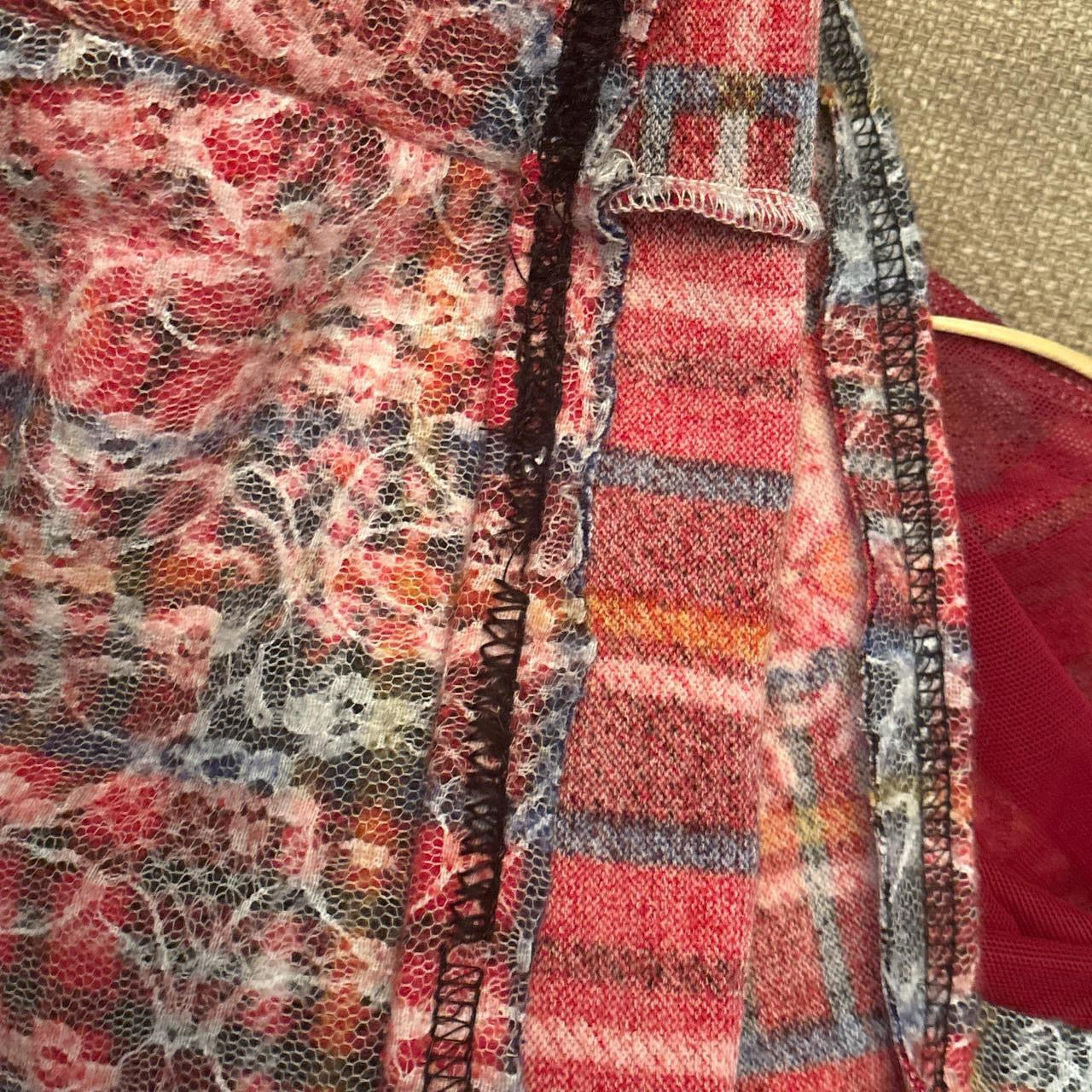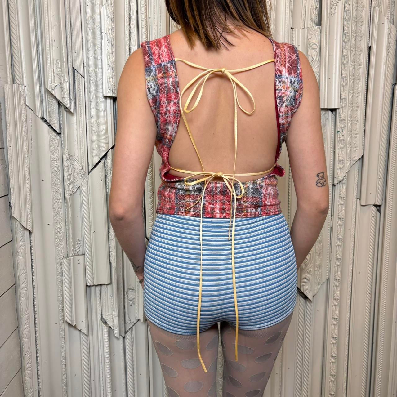 Multicolor plaid and lace print boat neck top with open neck and cream stain ties on back. Top is in excellent condition but thread at hem has been resown. Handmade.