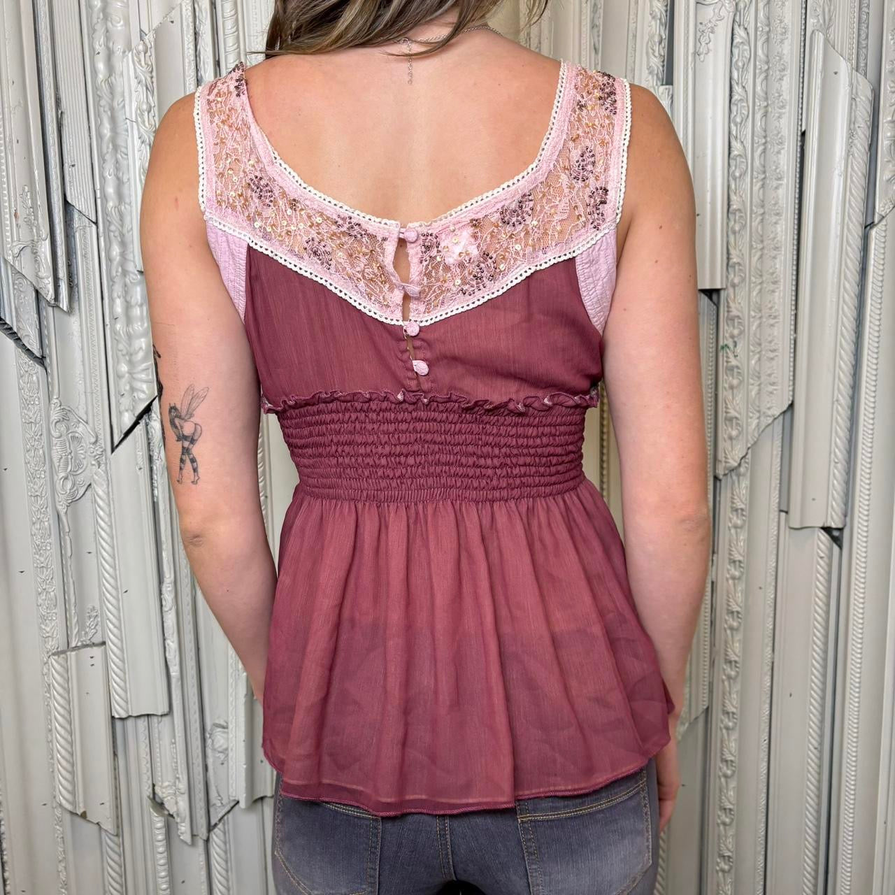 Nolita plum and pink blouse with elastic waist, beaded lace detailing