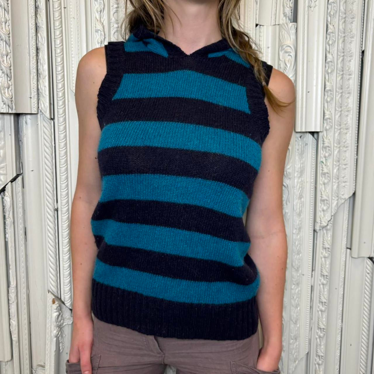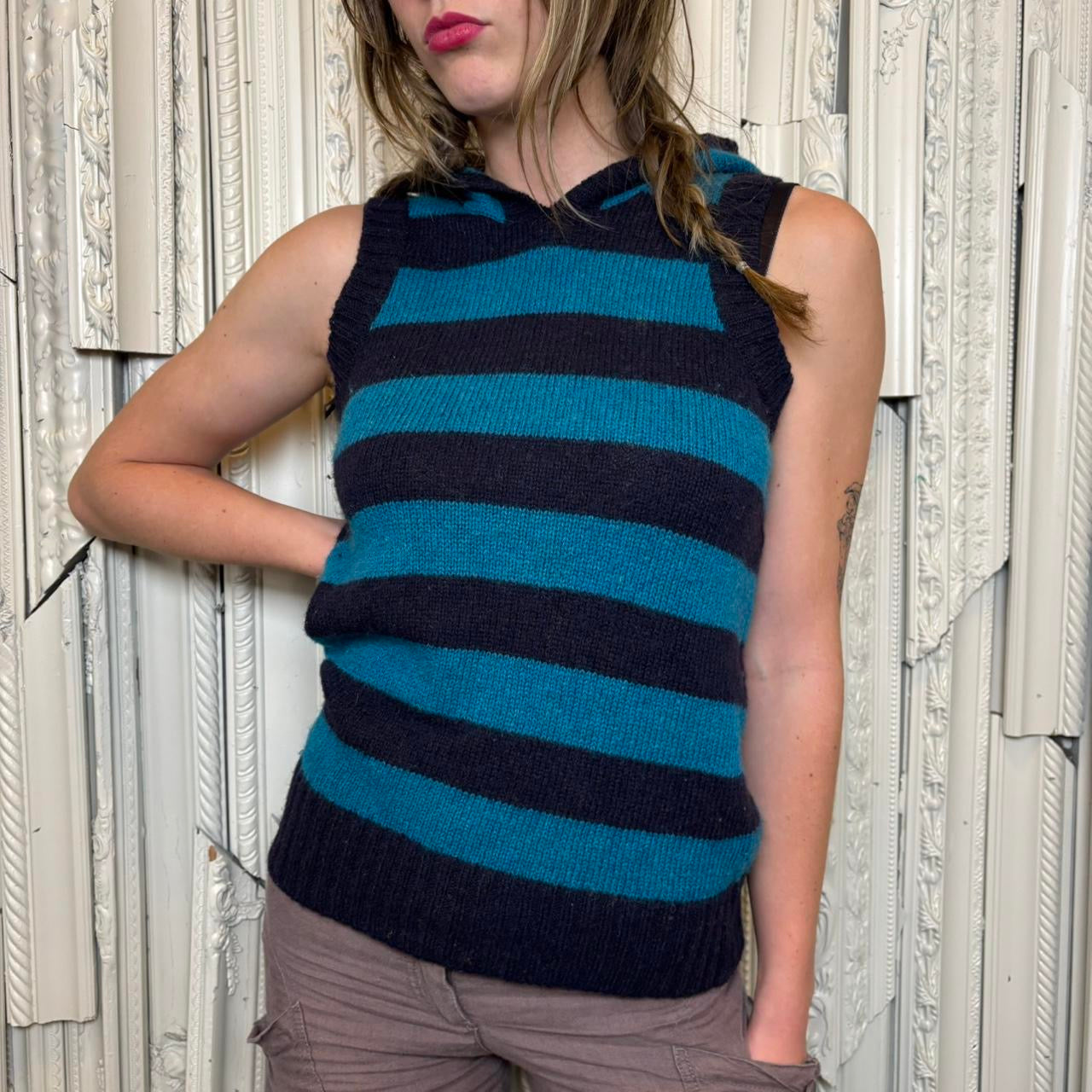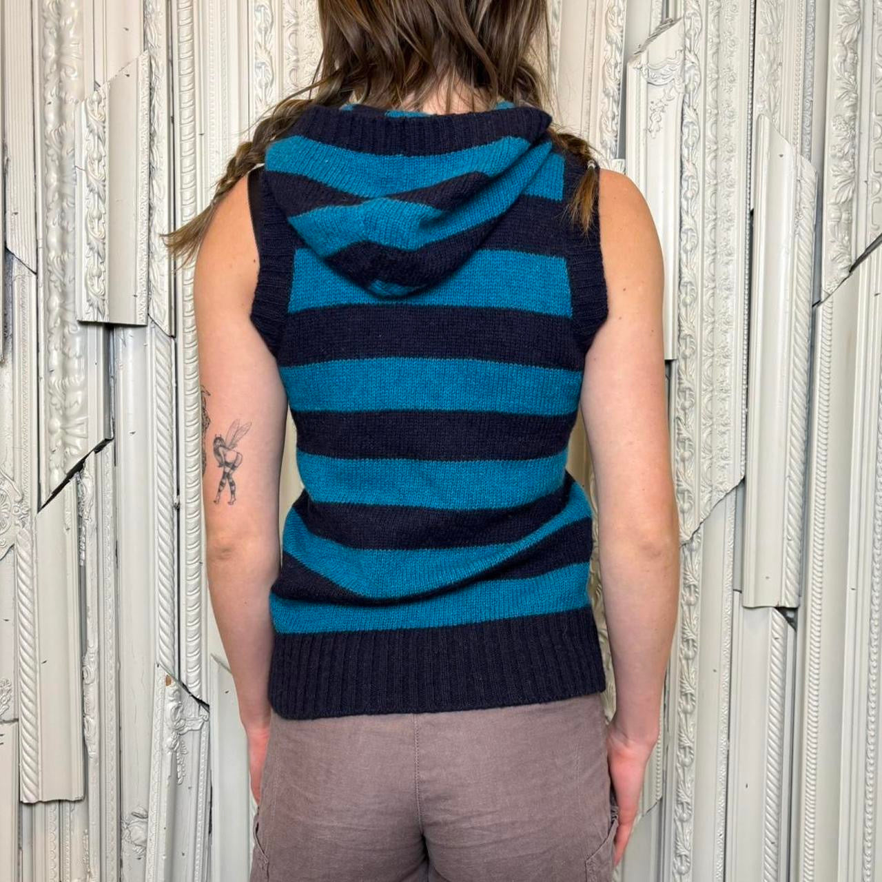 O.E.M. blue and navy striped knit sleeveless hooded sweater. Sweater is in excellent condition but has some pilling and is slightly itchy. No size or contents tag, best fit for size small.