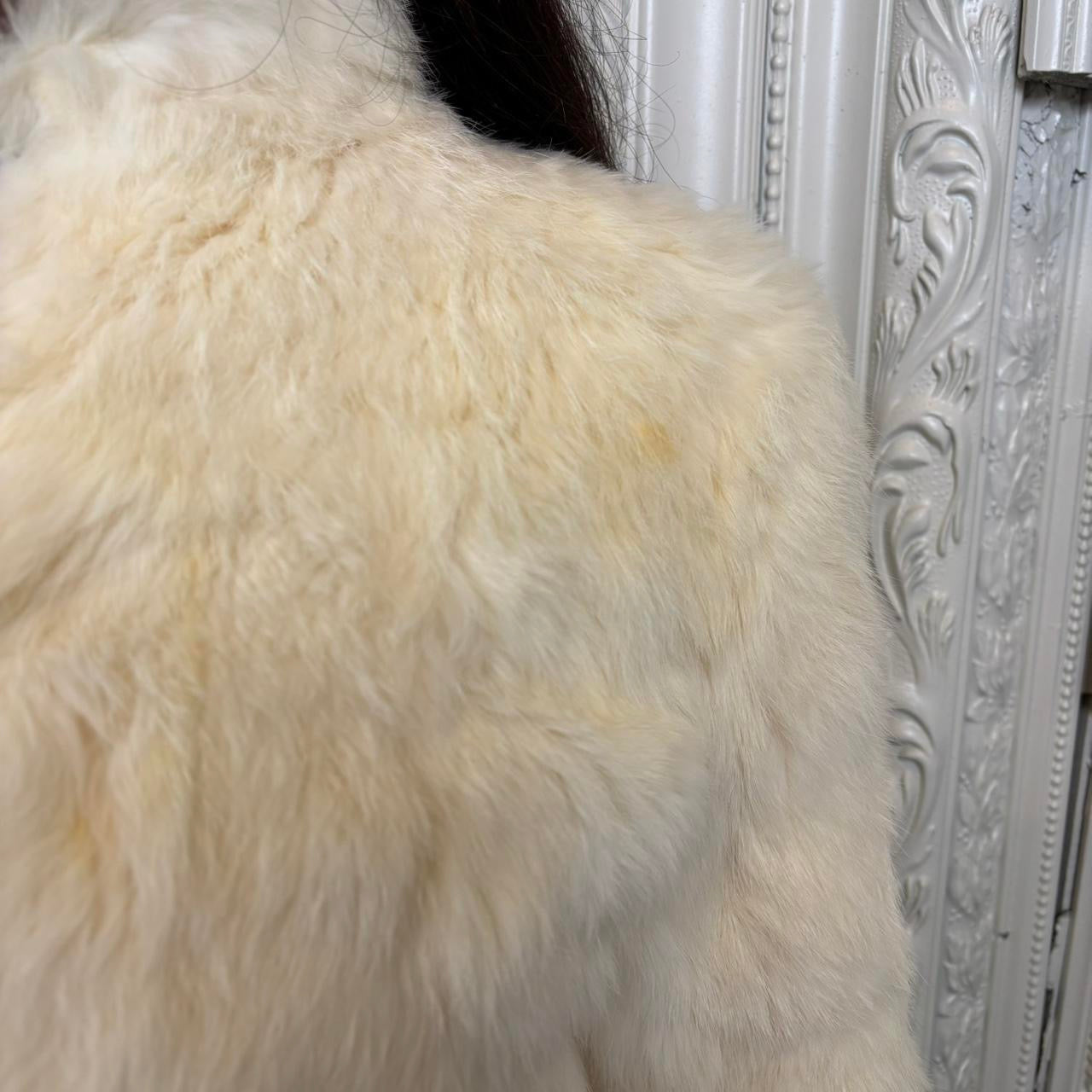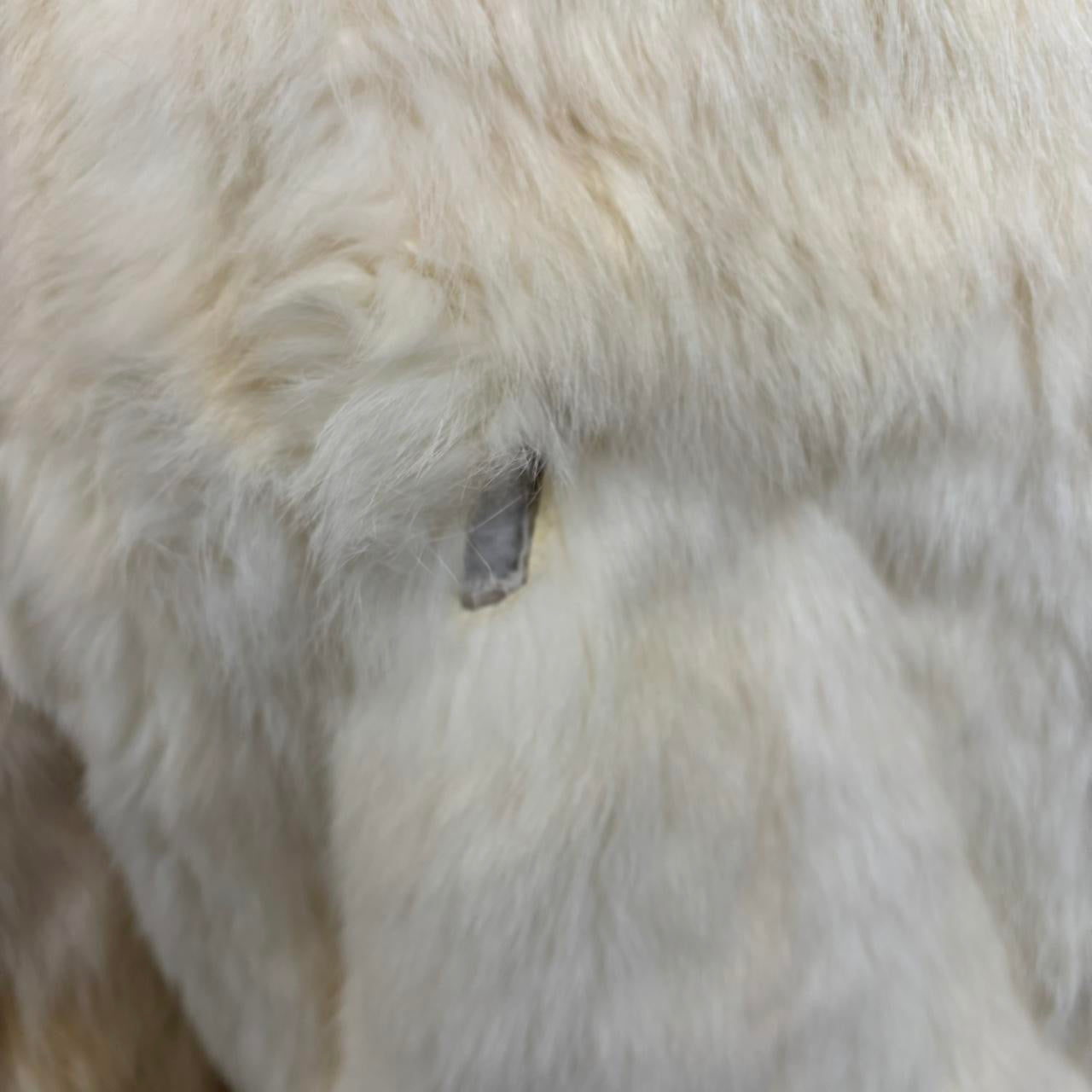 Rabbit fur (from France) zip up coat with pockets and knit hems, made in China. Coat is in good condition but has some staining and holes as shown.