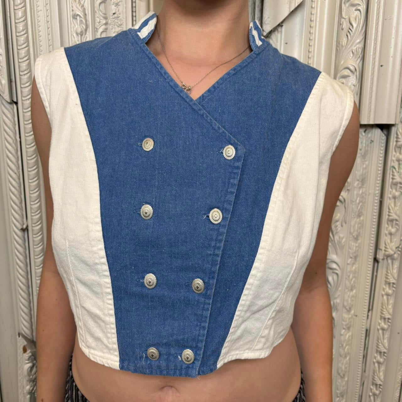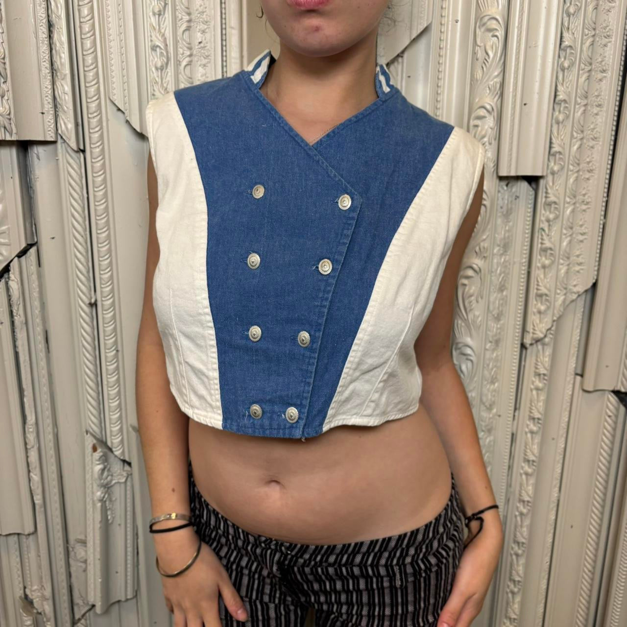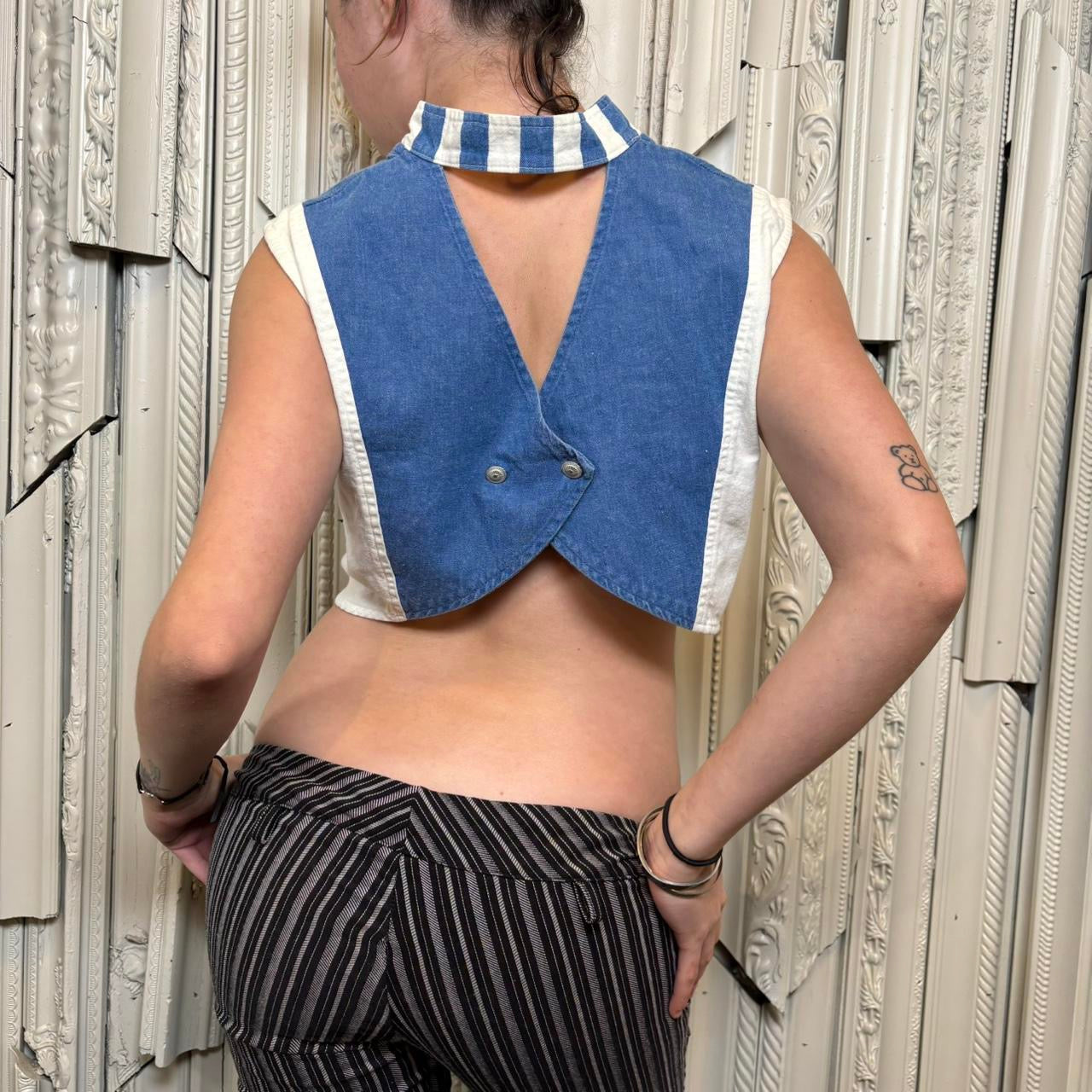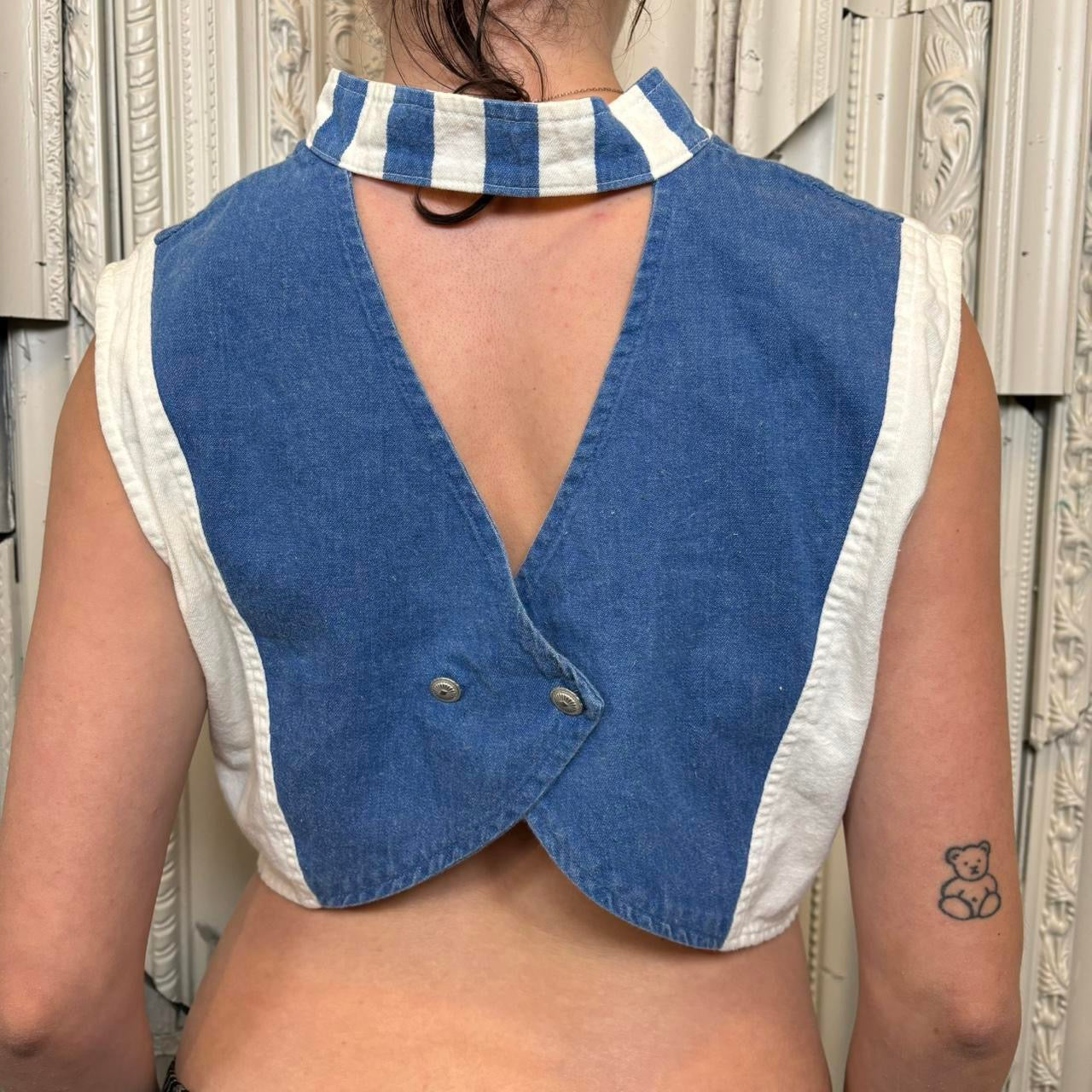 Roper 80s 100% cotton blue and white color block cropped “sailor” style vest with peep hole on back, made in USA. Vest is in excellent condition. Tag size medium, best fit for s/m. Model is 5’3 and wears size small.