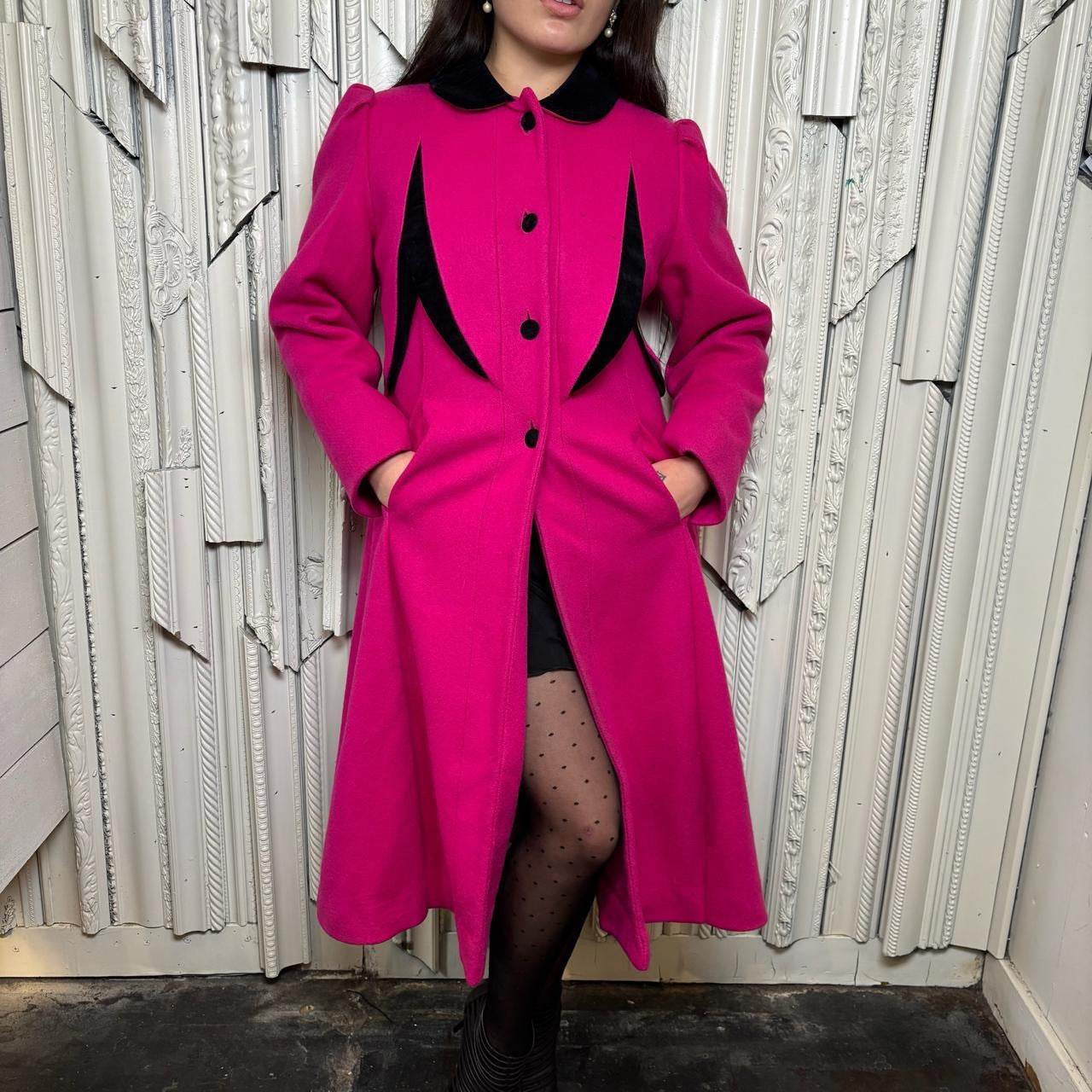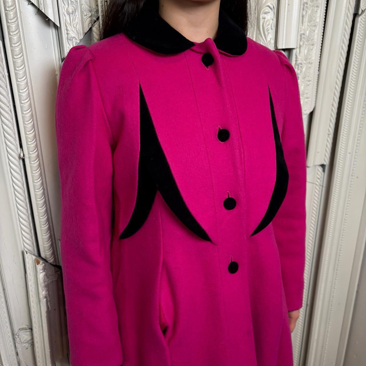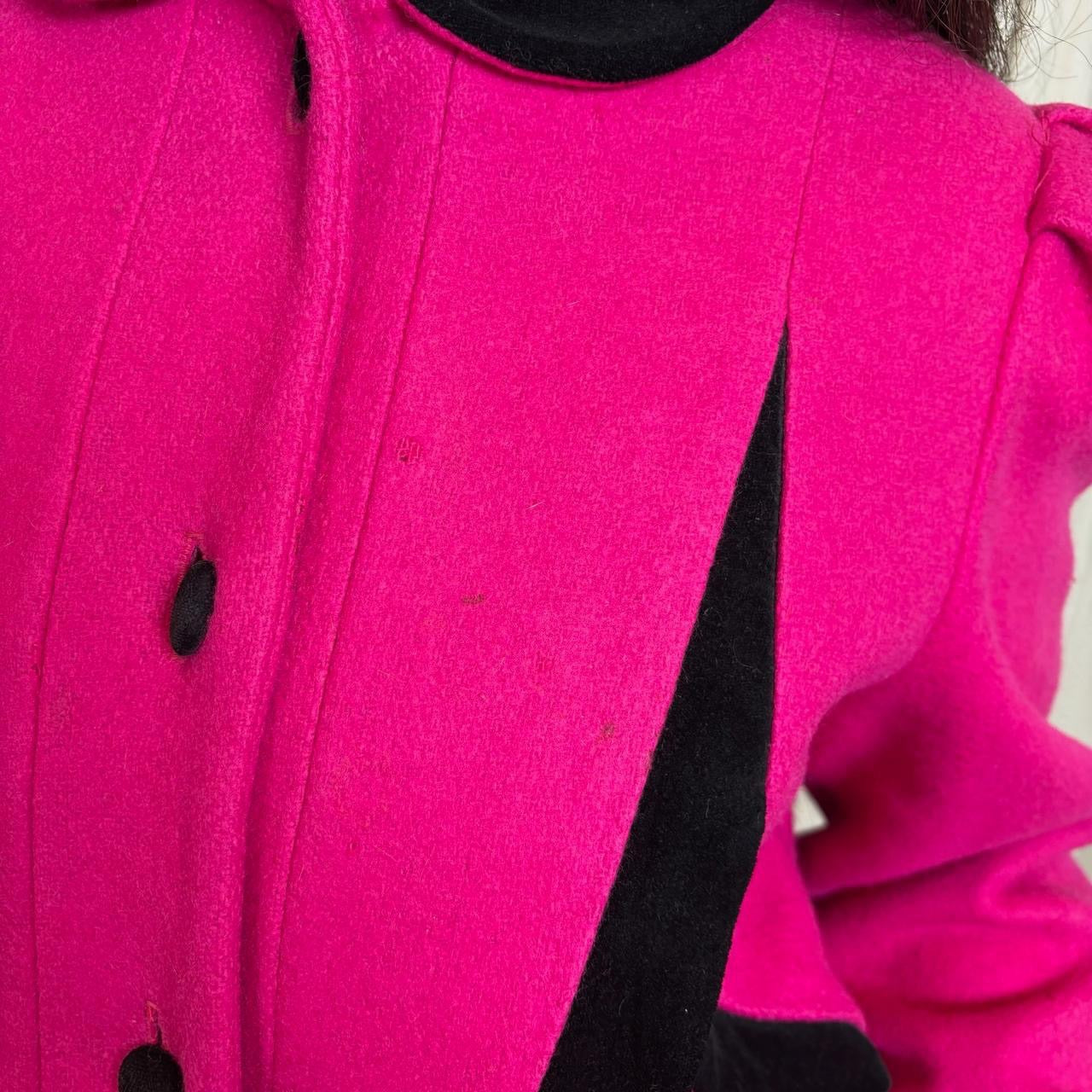 Rothschild wool pink and black button down trench coat with shoulder pads, made in USA. Coat is in good condition but has some staining as shown in photos.