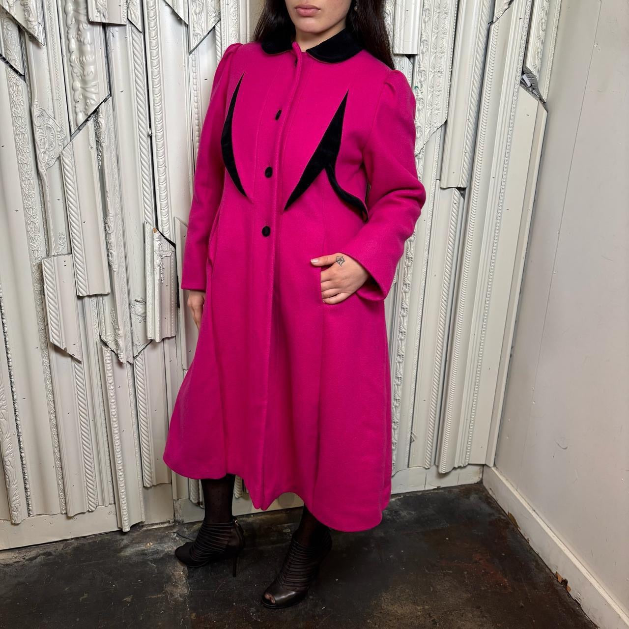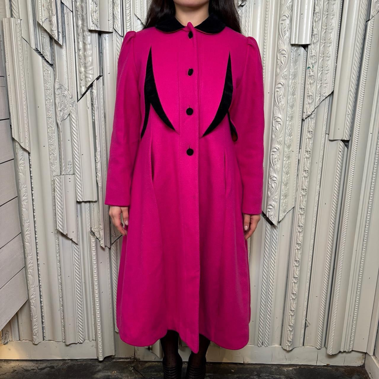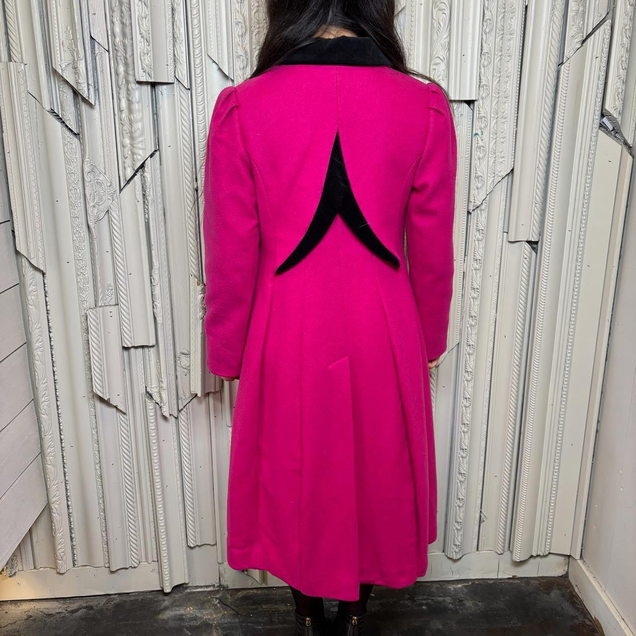 Rothschild wool pink and black button down trench coat with shoulder pads, made in USA. Coat is in good condition but has some staining as shown in photos.