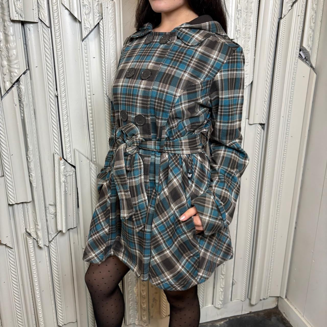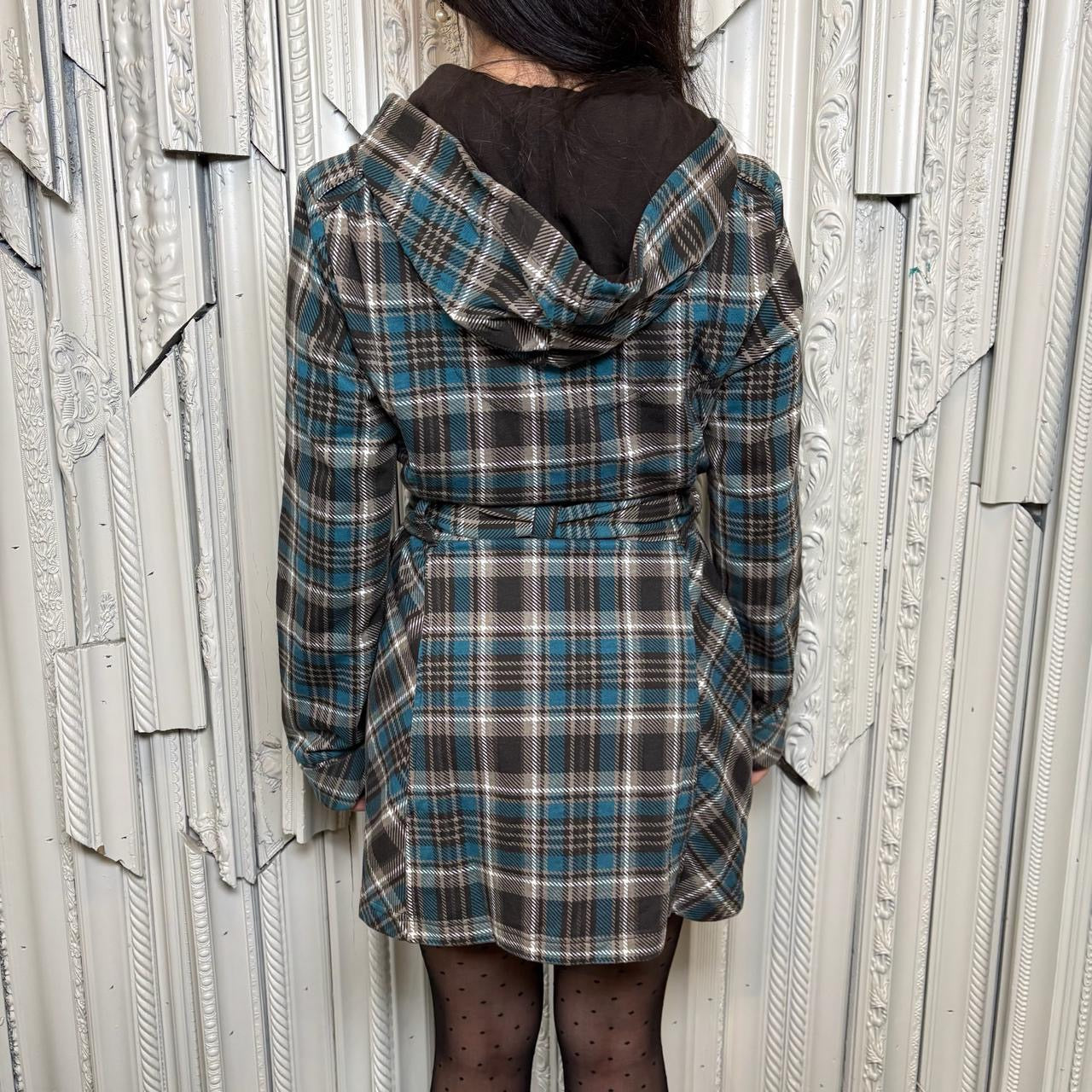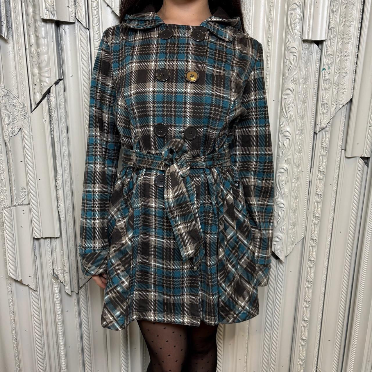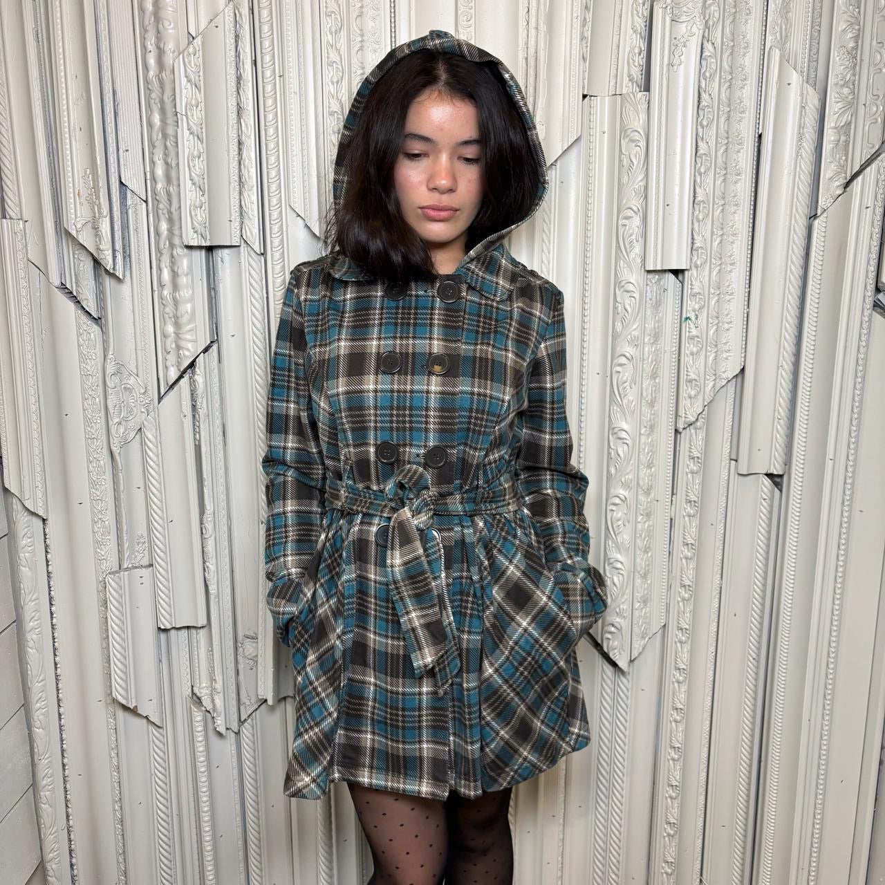 Self Esteem blue and grey plaid button down coat with hood and waist tie. Coat is in excellent condition.
