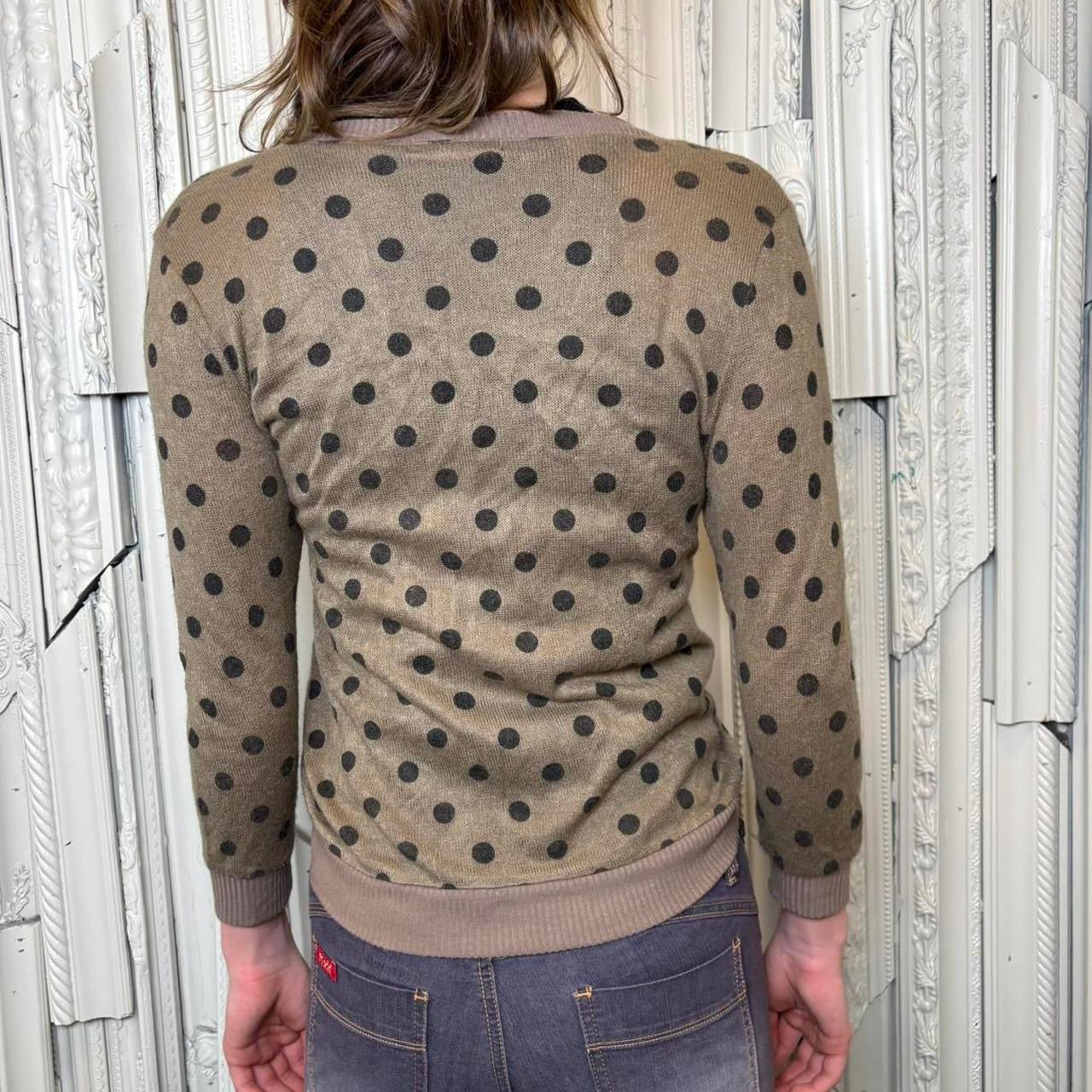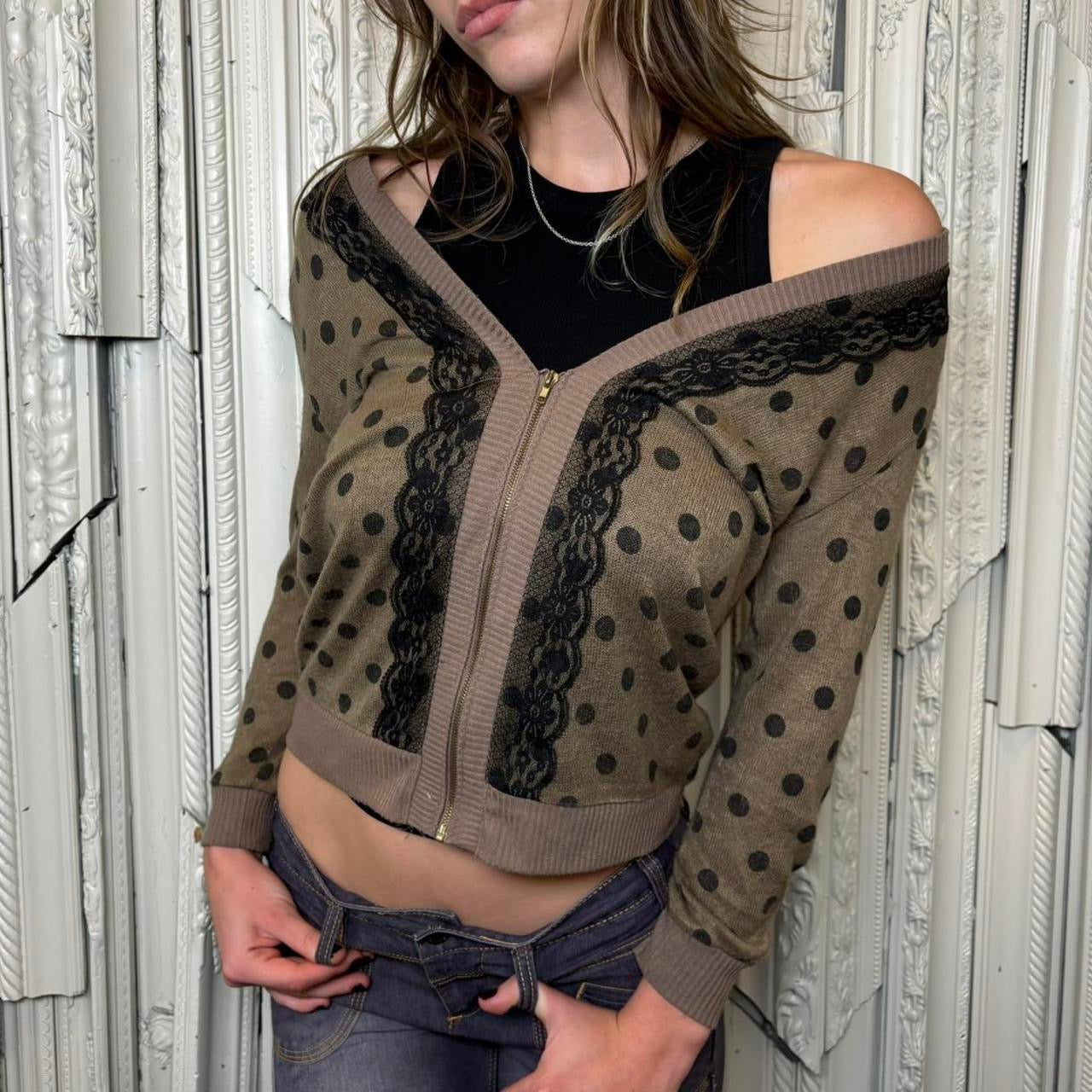 Spoiled brown and black polka dot zip up cardigan with lace detailing. Sweater is in excellent condition. Tag size medium, best fit for s/m. Model is 5’9 and wears size small.