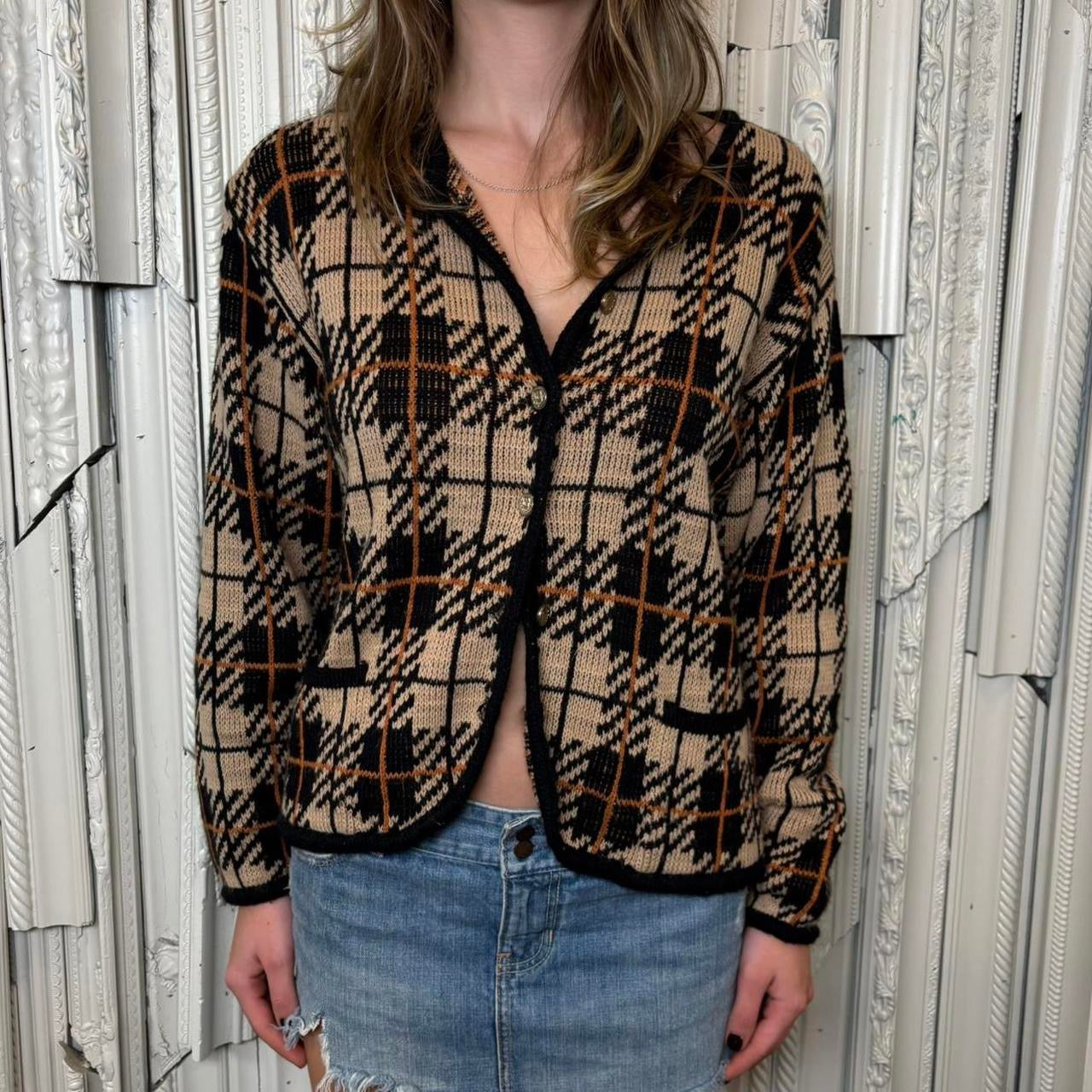 Tally Ho 100% acrylic multicolored plaid cardigan with with gold buttons and pockets, made in China. Sweater is in excellent condition. Tag size large, best fit for m/l. Model is 5’9 and wears size small.