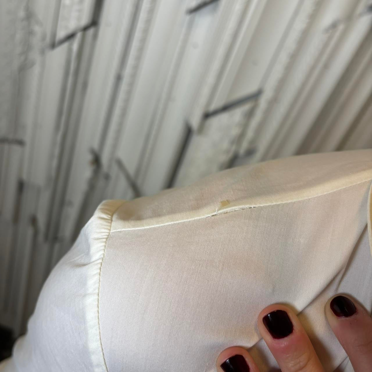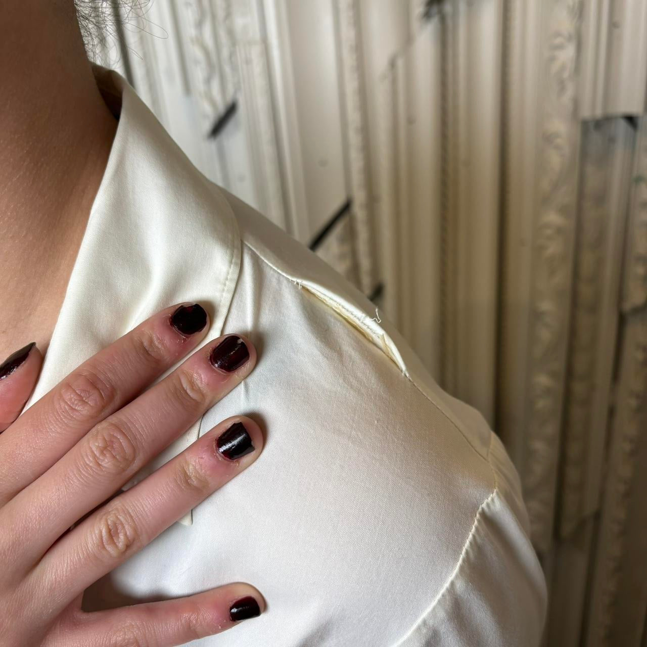 Theory cotton/nylon/spandex blend white button down with ruching around waist. Top is in good condition but the seams are coming undone on shoulders as shown. Tag size petite, best fit for medium. Model is 5’3 and wears size small.