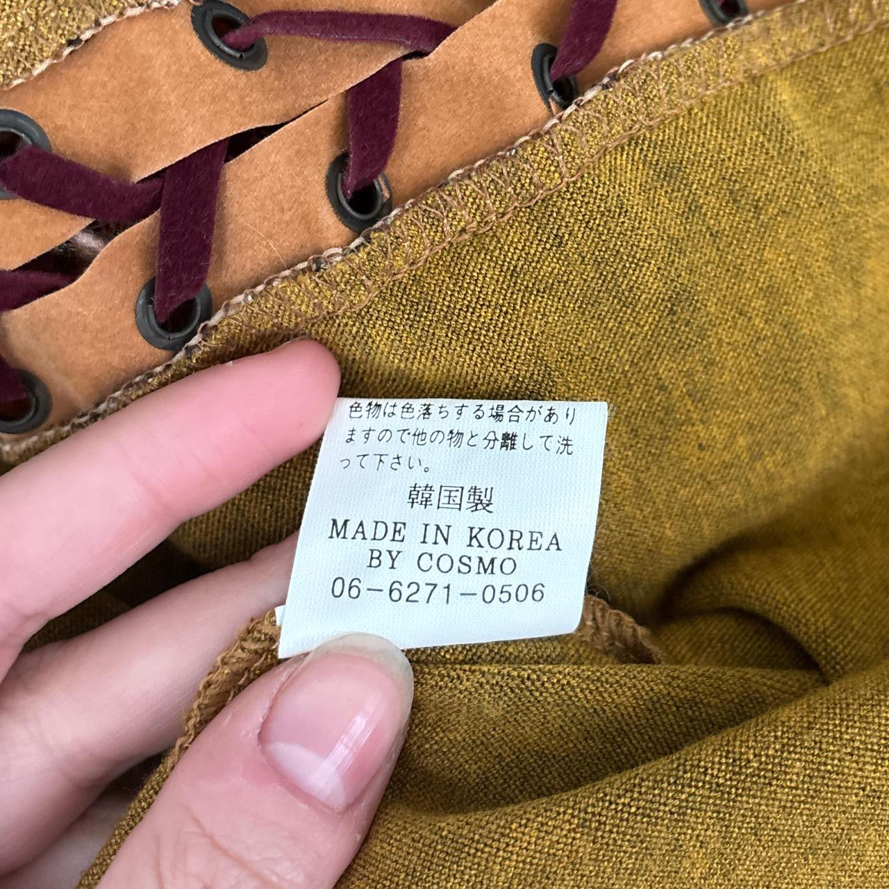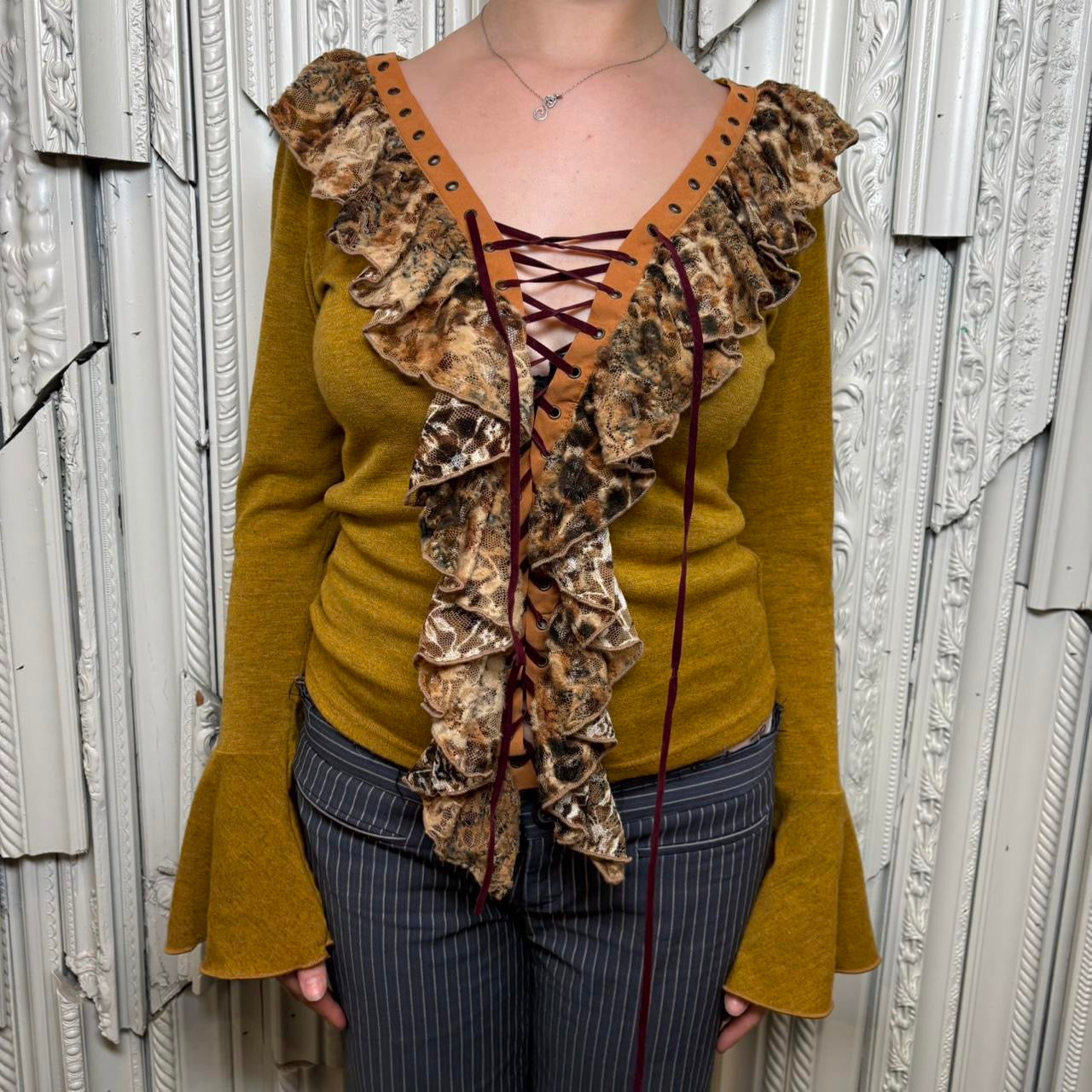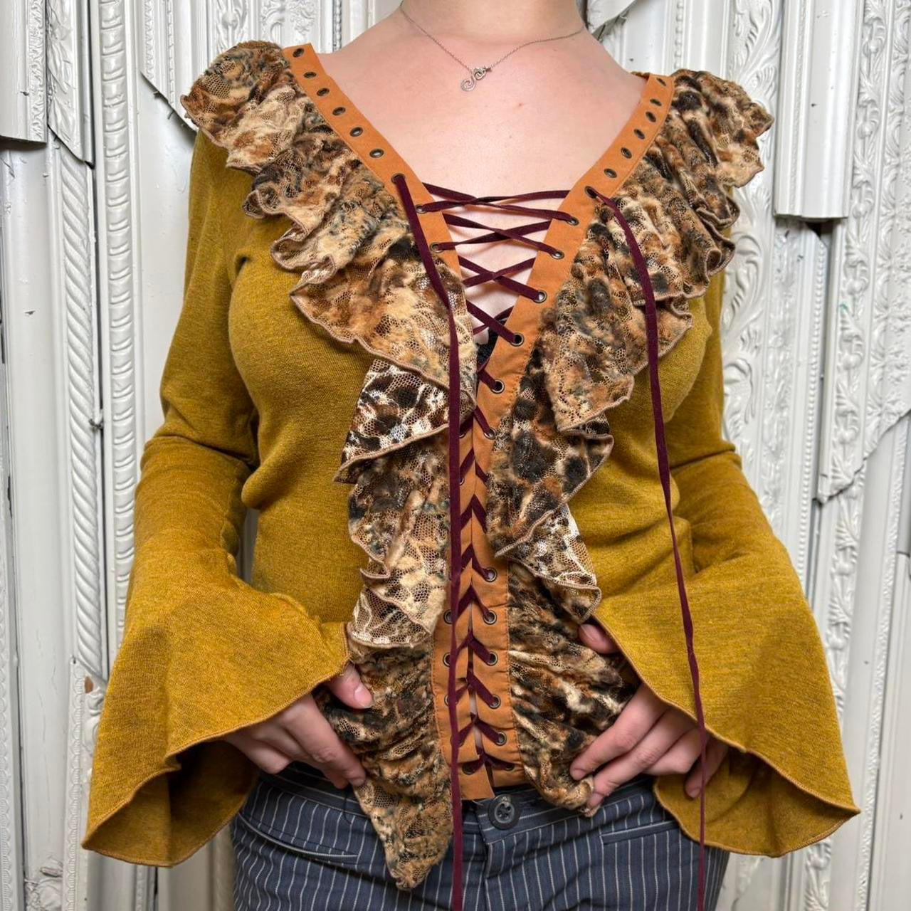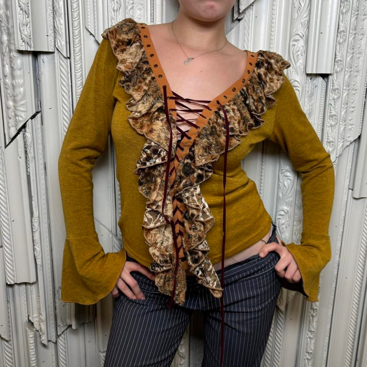 Tip Tool mustard yellow v neck full lace up blouse with animal print lace trim, grommets and bell sleeves, made in Korea. Top is in excellent condition. Best fit for size s/m. Model is 5’3 and wears size small.