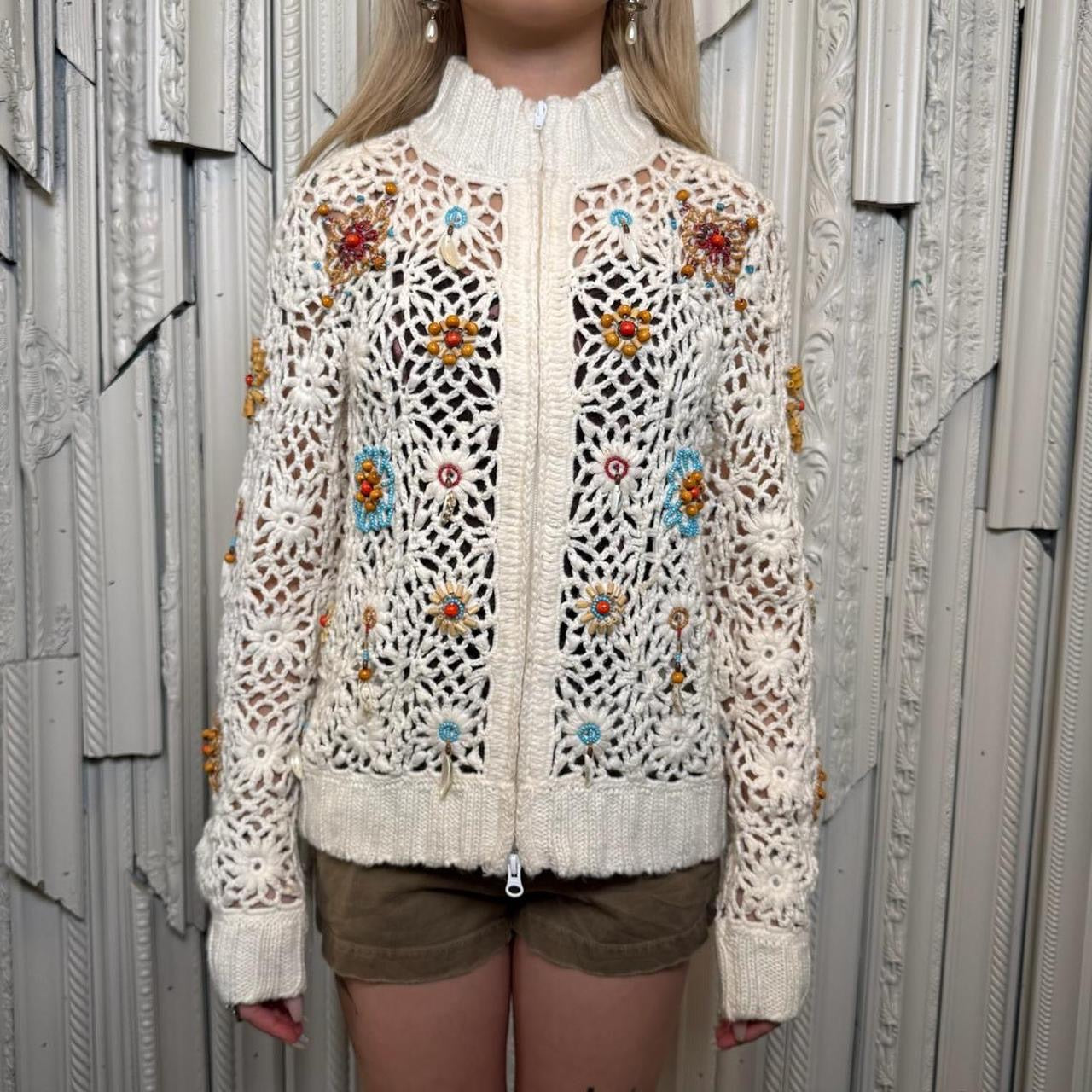 Y2K white knit double zipper mock neck sweater with beaded detailing by Together. Sweater is 85% acrylic and 15% wool. Sweater is in excellent condition. Tag size medium, best for medium. Model is 5’1 and wears size xs. Bust 23.5” Length 24” Sleeve 26.5”
