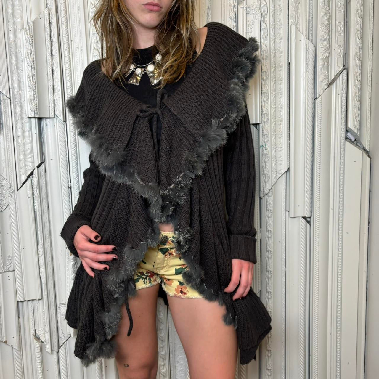 Venus grey knit cardigan with faux fur trim ruffle collar