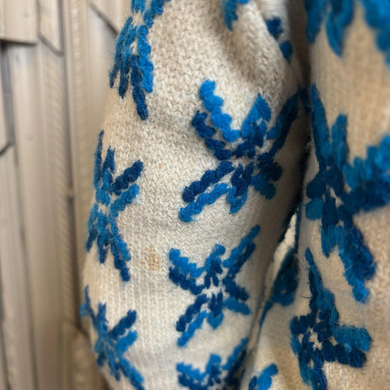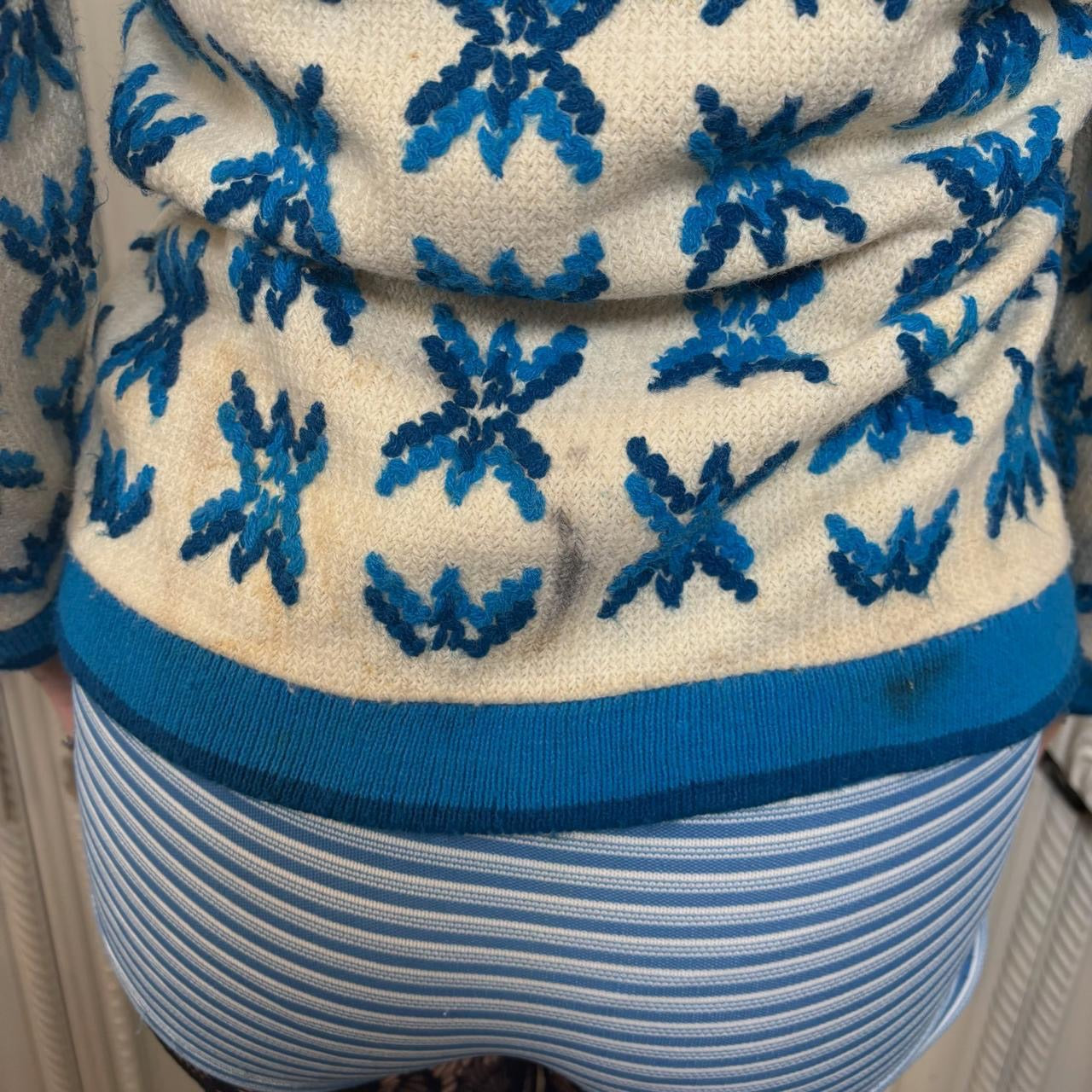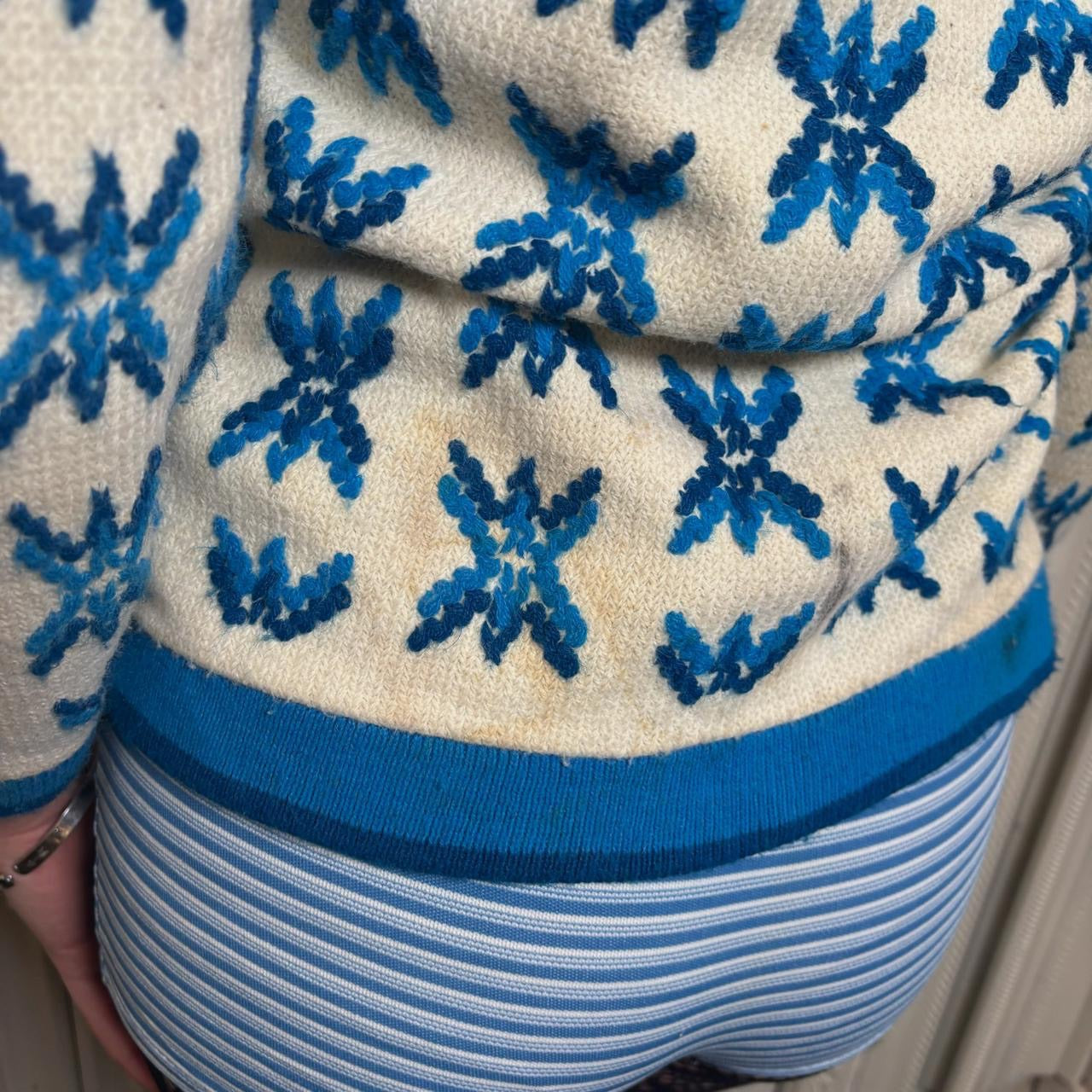Vintage 50s/60s blue and white 100% acrylic knit slim fit button down cardigan. Sweater is in good condition but has some staining as shown.