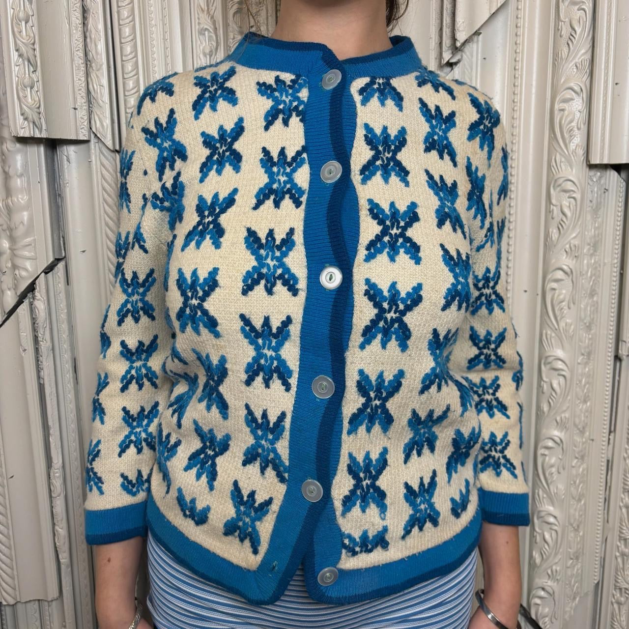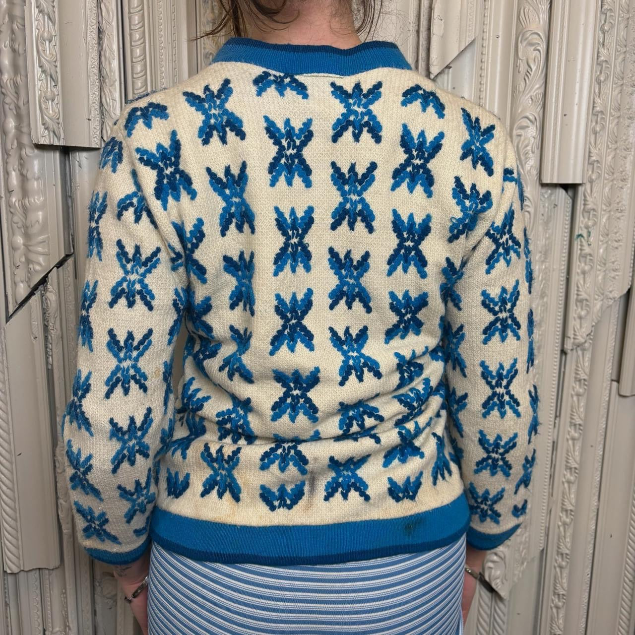 Vintage 50s/60s blue and white 100% acrylic knit slim fit button down cardigan