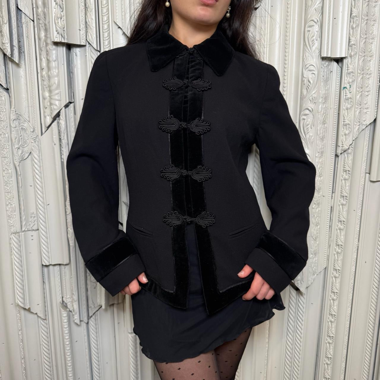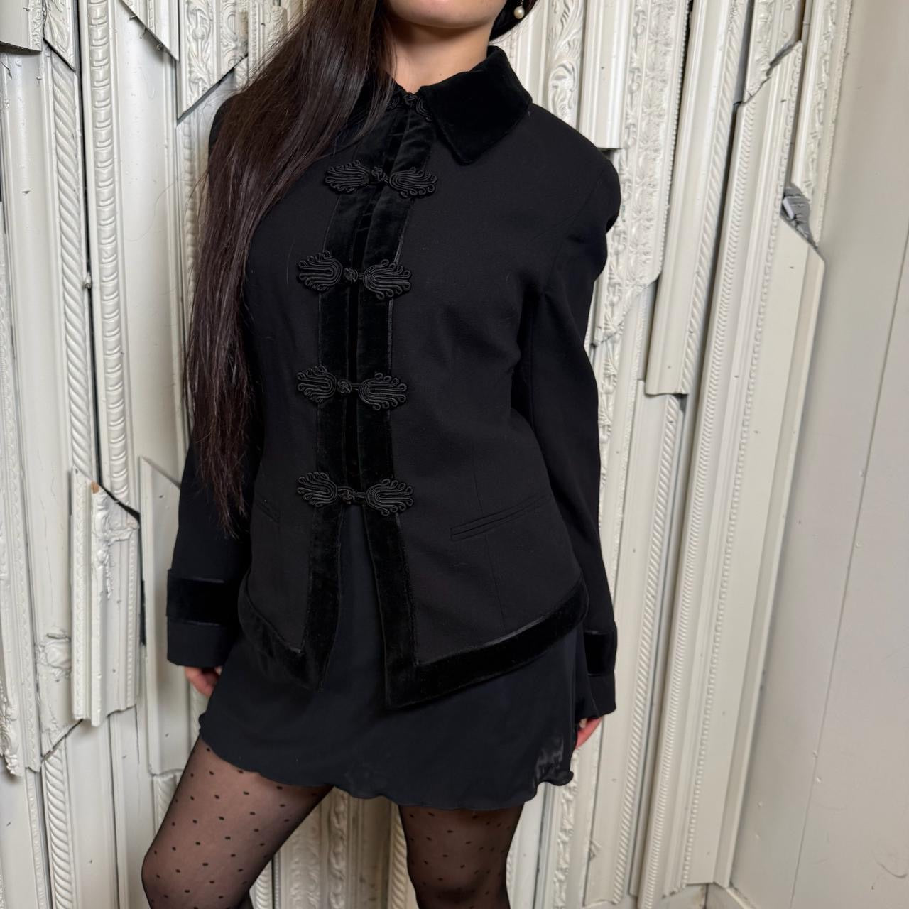 Virtue rayon over jacket with velvet trim, appliqué buttons and shoulder pads