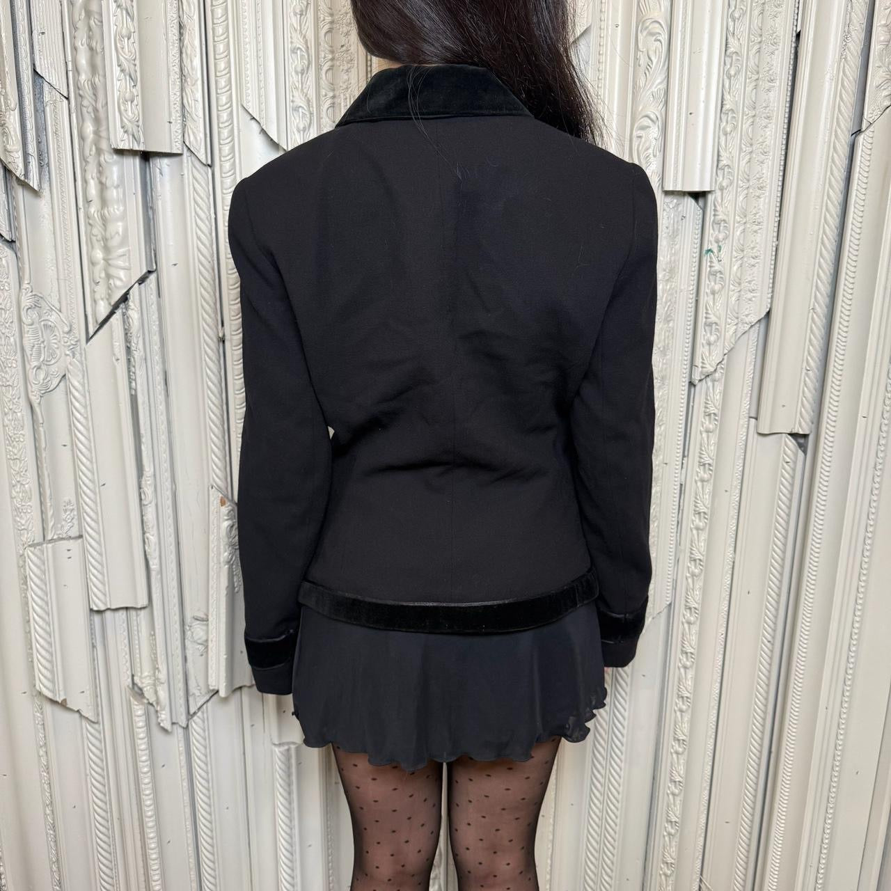 Virtue rayon over jacket with velvet trim, appliqué buttons and shoulder pads. Jacket is in excellent condition.