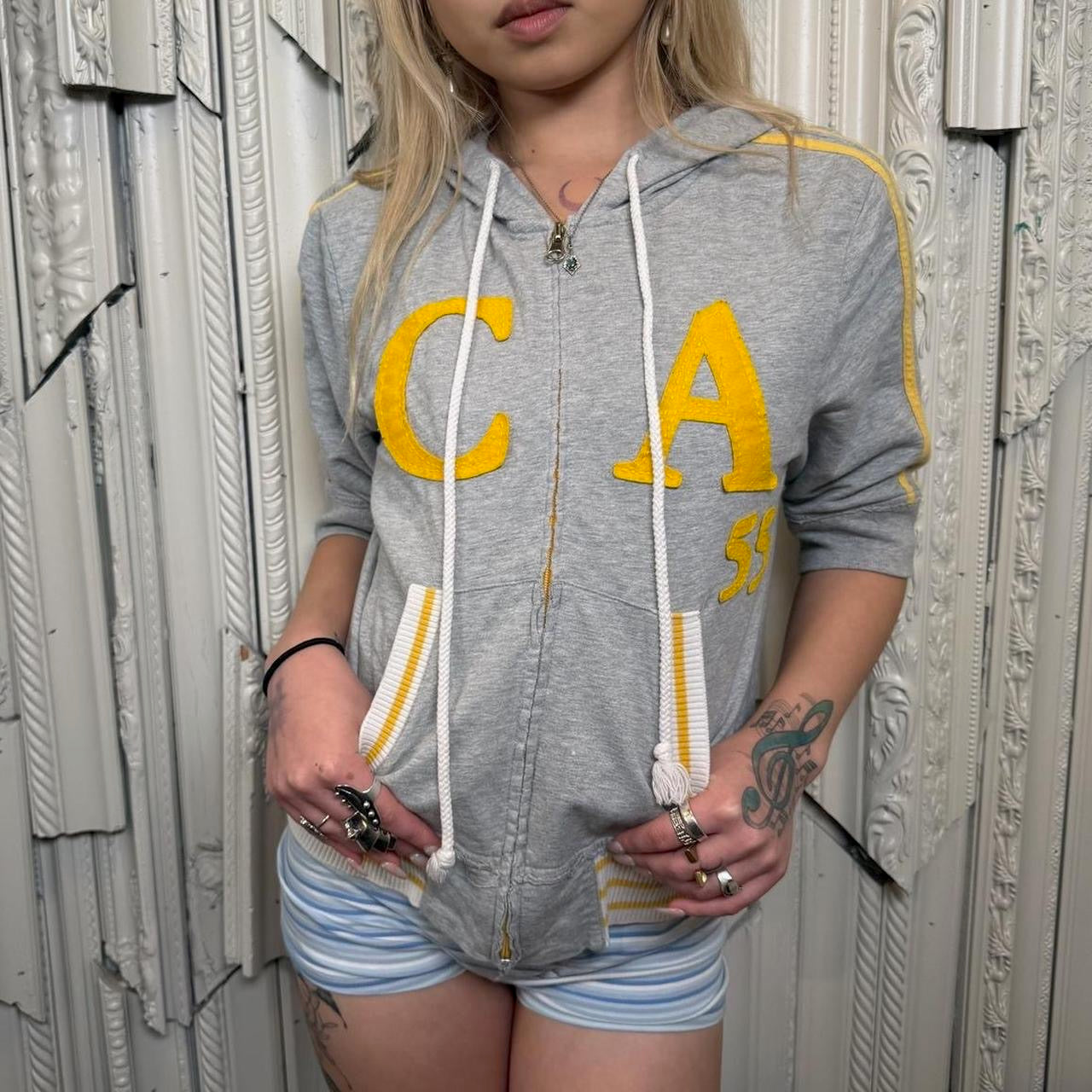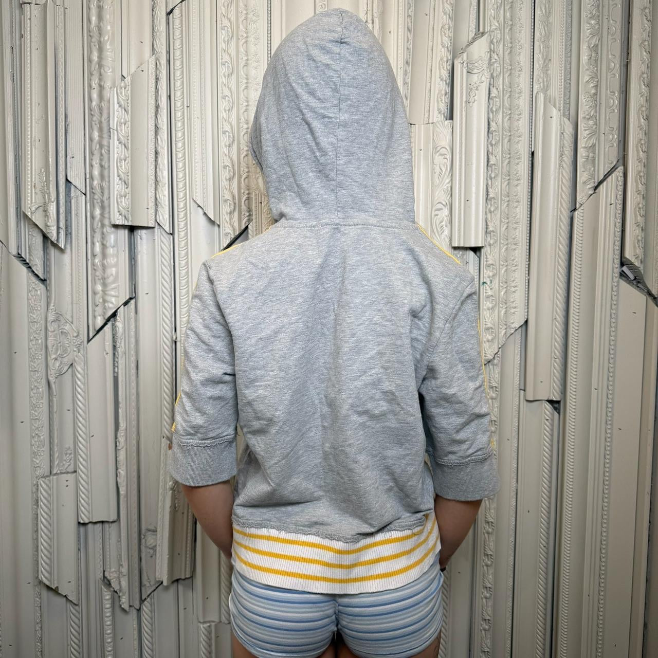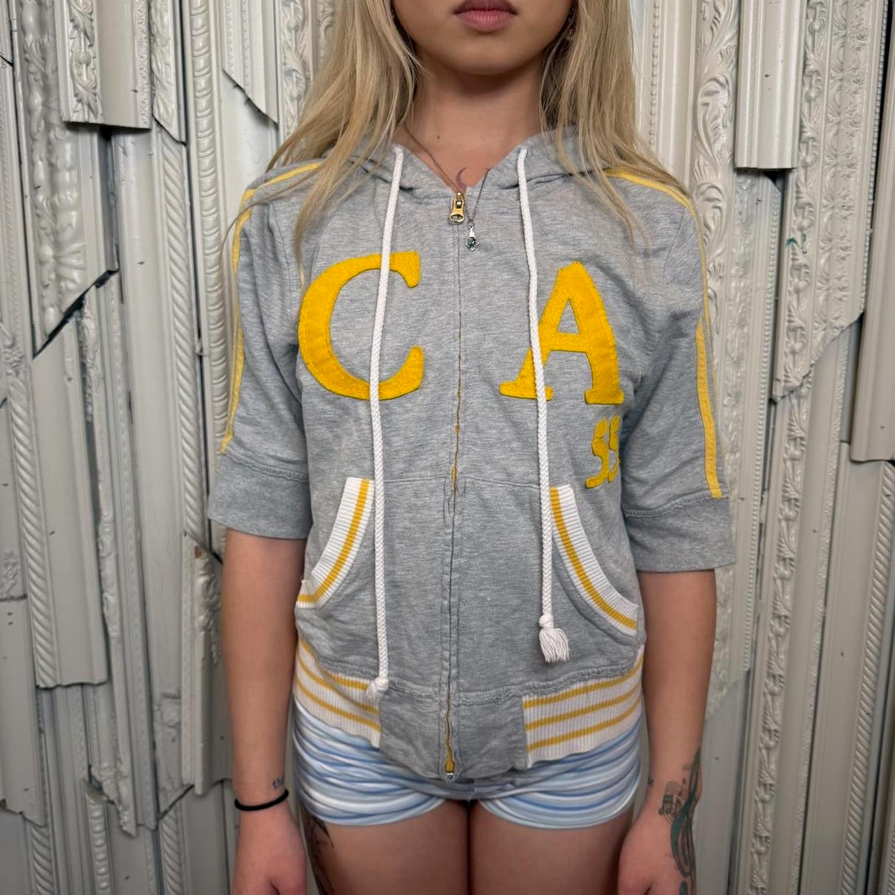 Y2K grey and yellow “CA 55” short sleeve zip up hoodie