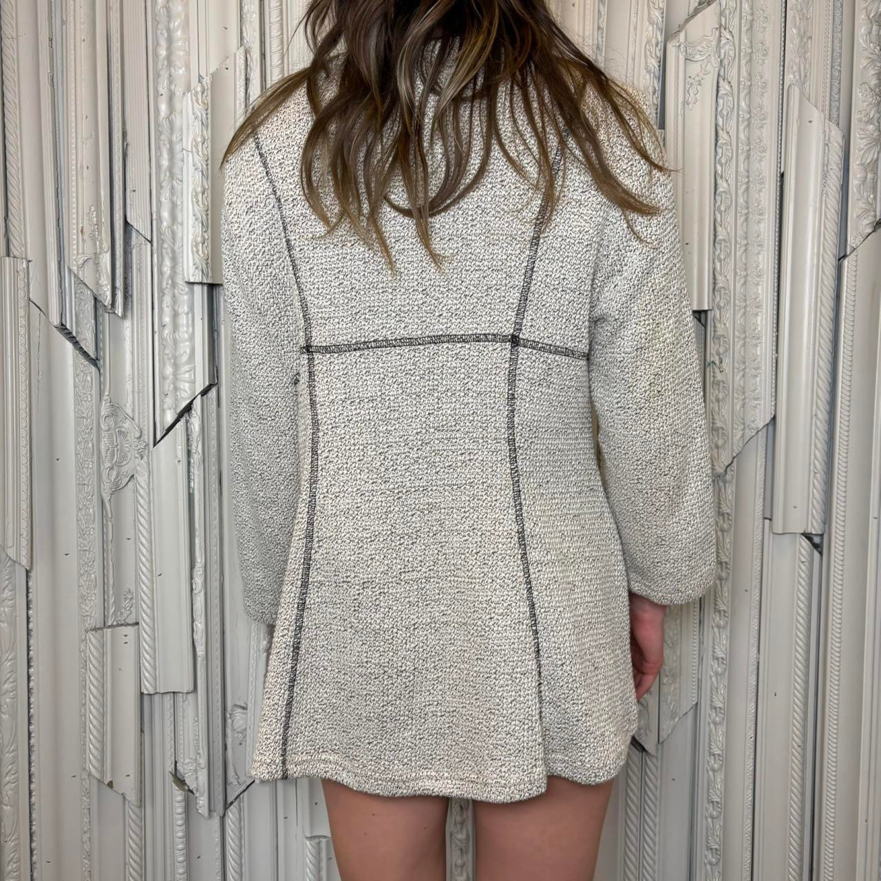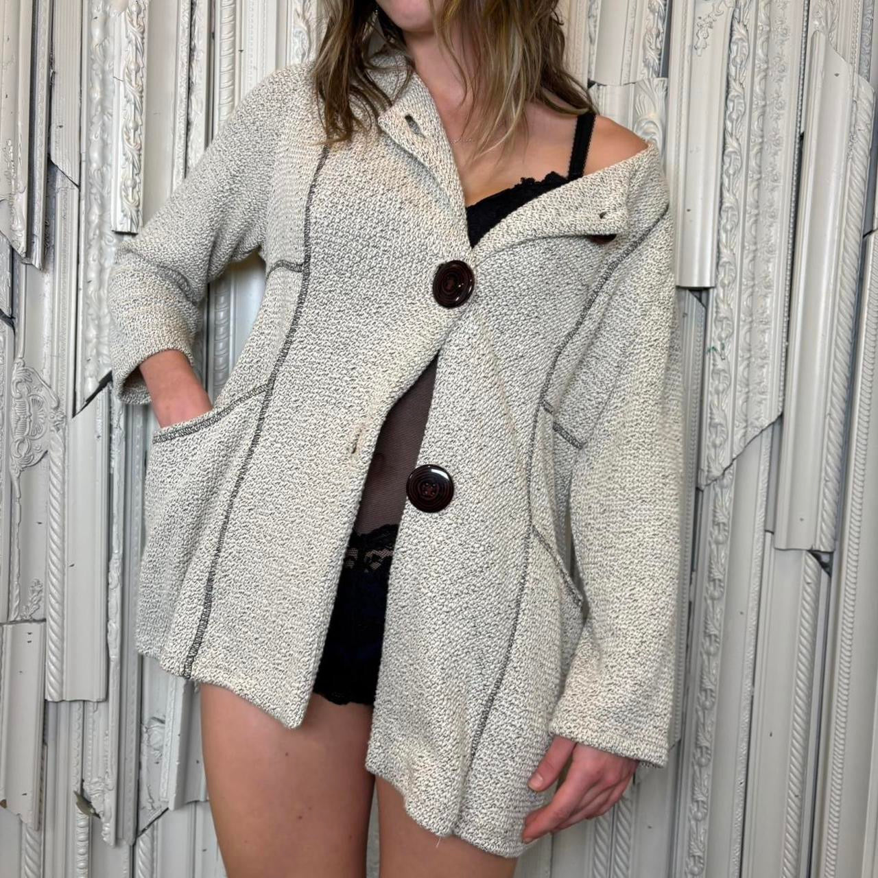 Yushi cotton/polyester blend black and grey button down cardigan with pockets, made in USA. Sweater is in excellent condition. Tag size large, best fit for M/L. Model is 5’9 and wears size small.